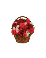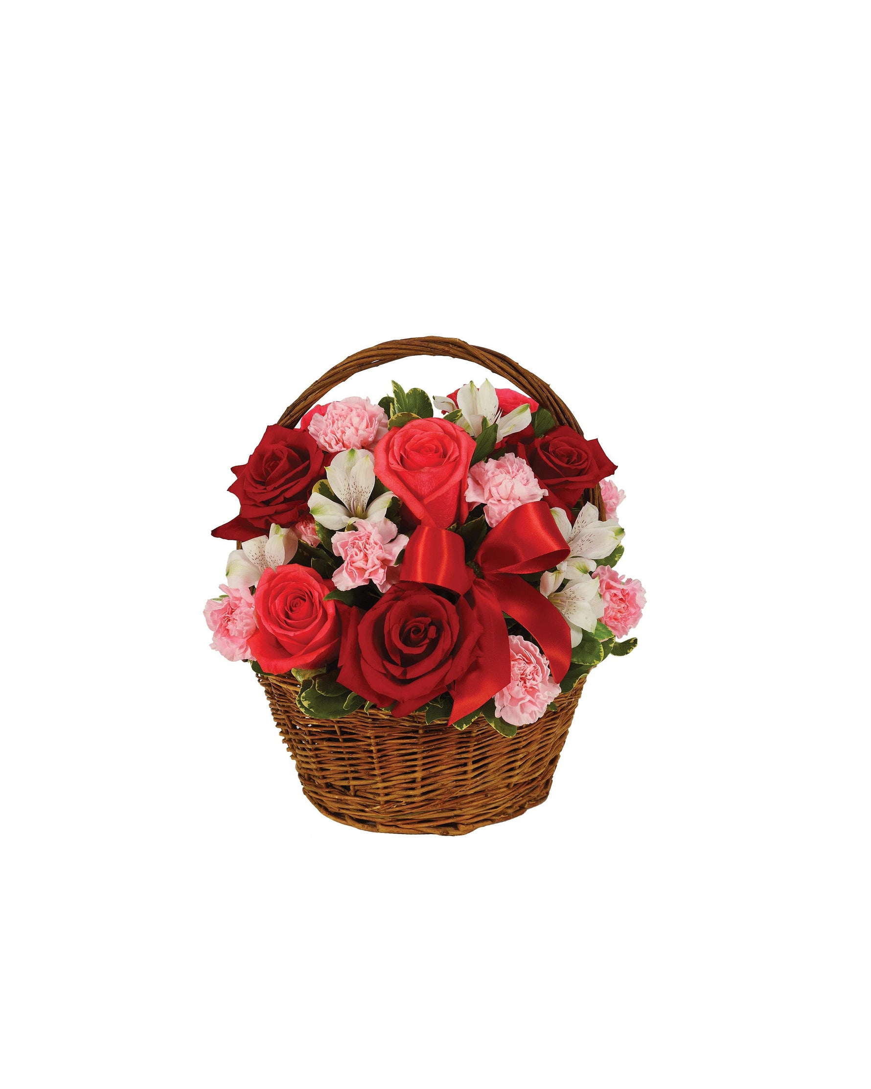 Entirely irresistible in every imaginable way, this floral stunner can't help but be on everyone's Valentine's Day wish list. Red and hot pink roses collaborate with white alstroemeria and pink mini carnations in a lovely willow basket capped off by a beautiful red satin ribbon.