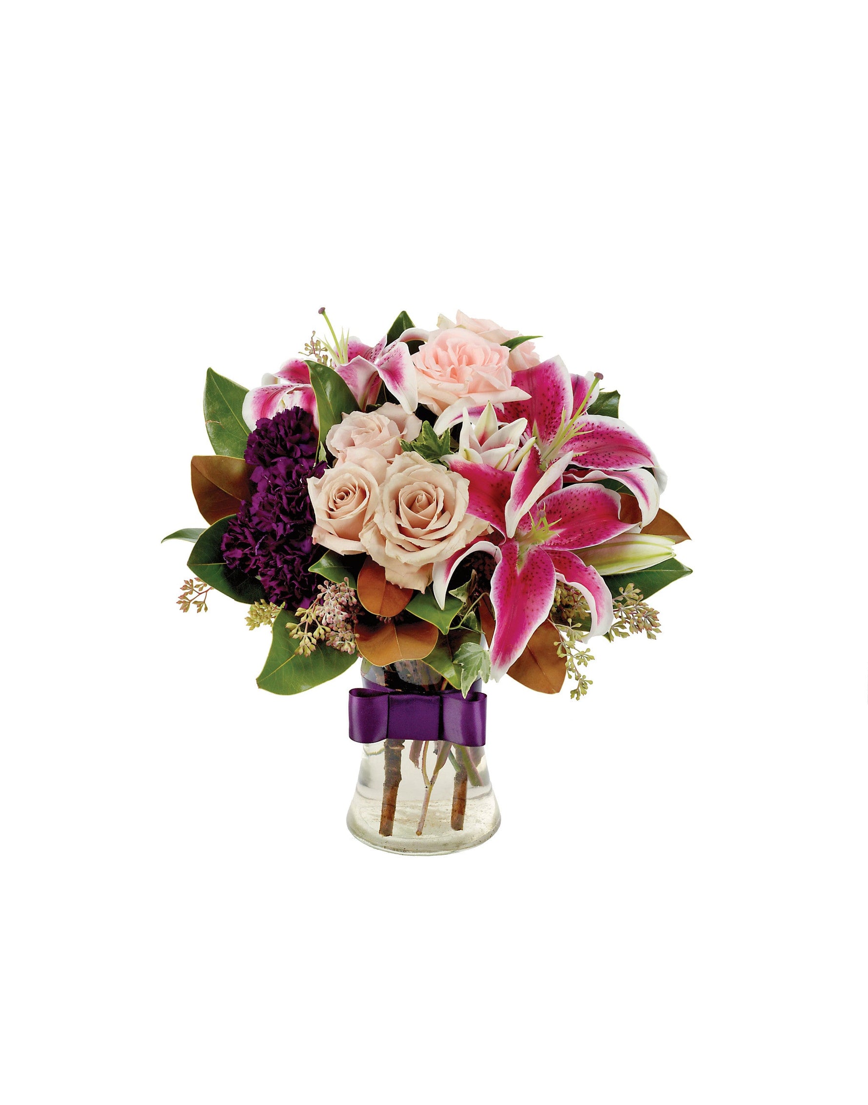 La era victoriana era sinónimo de romance... y eso es exactamente lo que transmite esta provocativa combinación de lirios Stargazer, rosas rosas y del Sahara, claveles morados, hojas de magnolia y eucalipto en un jarrón transparente con una cinta de raso morada.