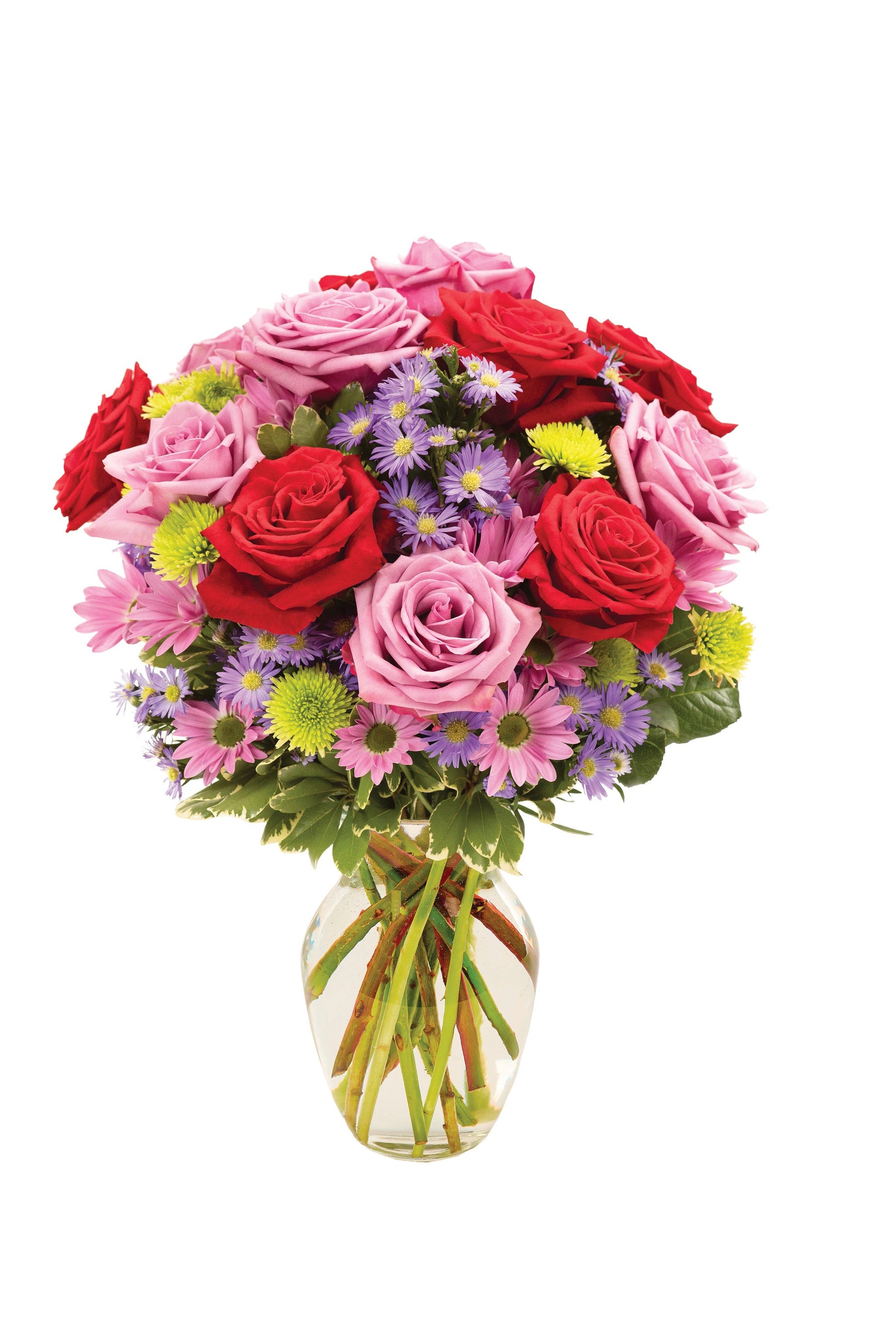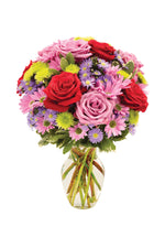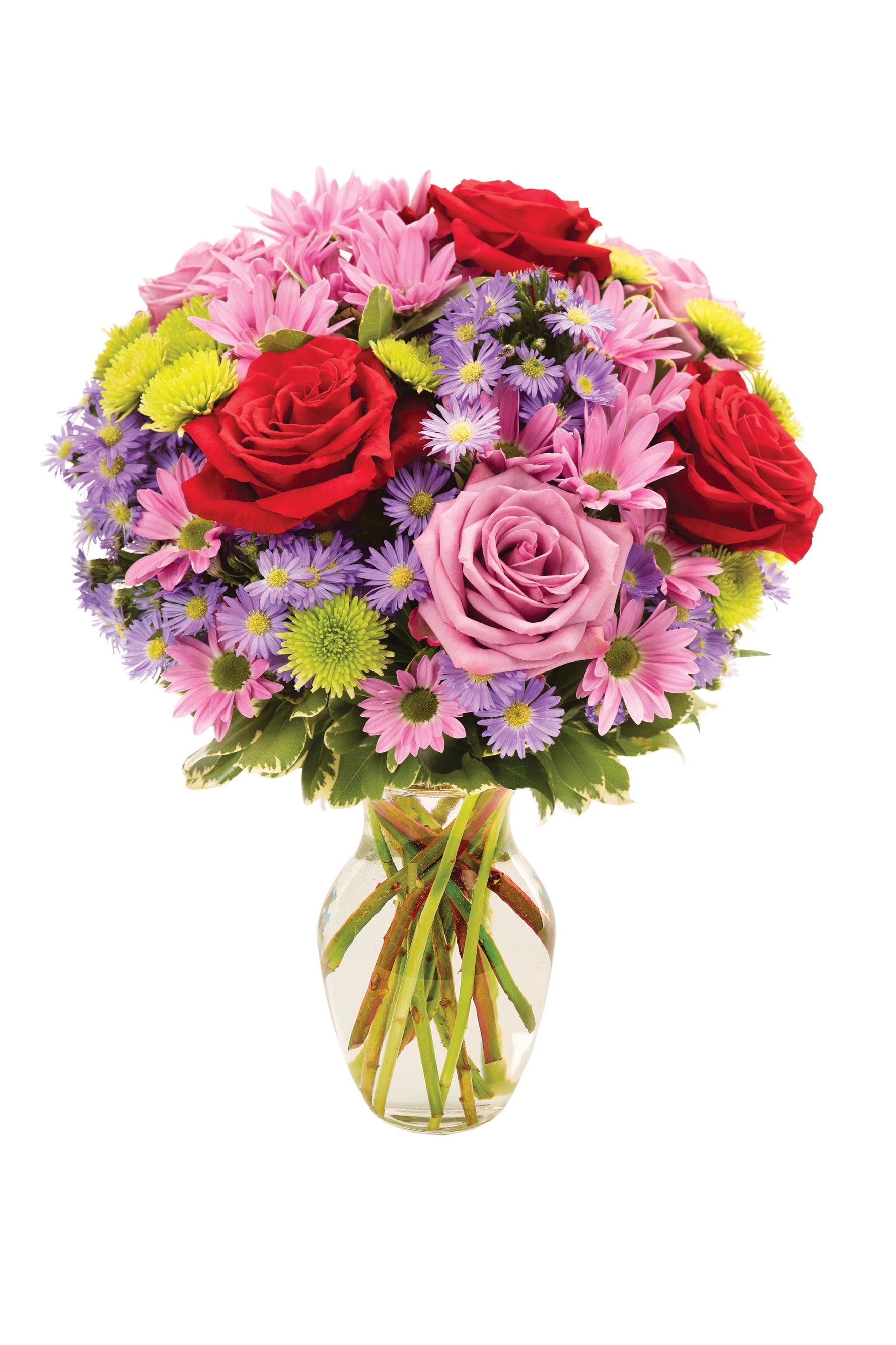 La esencia de una suave brisa primaveral complementada con un sol brillante se captura de manera majestuosa y espléndida en este deslumbrante arreglo de rosas, margaritas, flores de Monte Casino, athos y pittosporum en un jarrón transparente de color rosa.