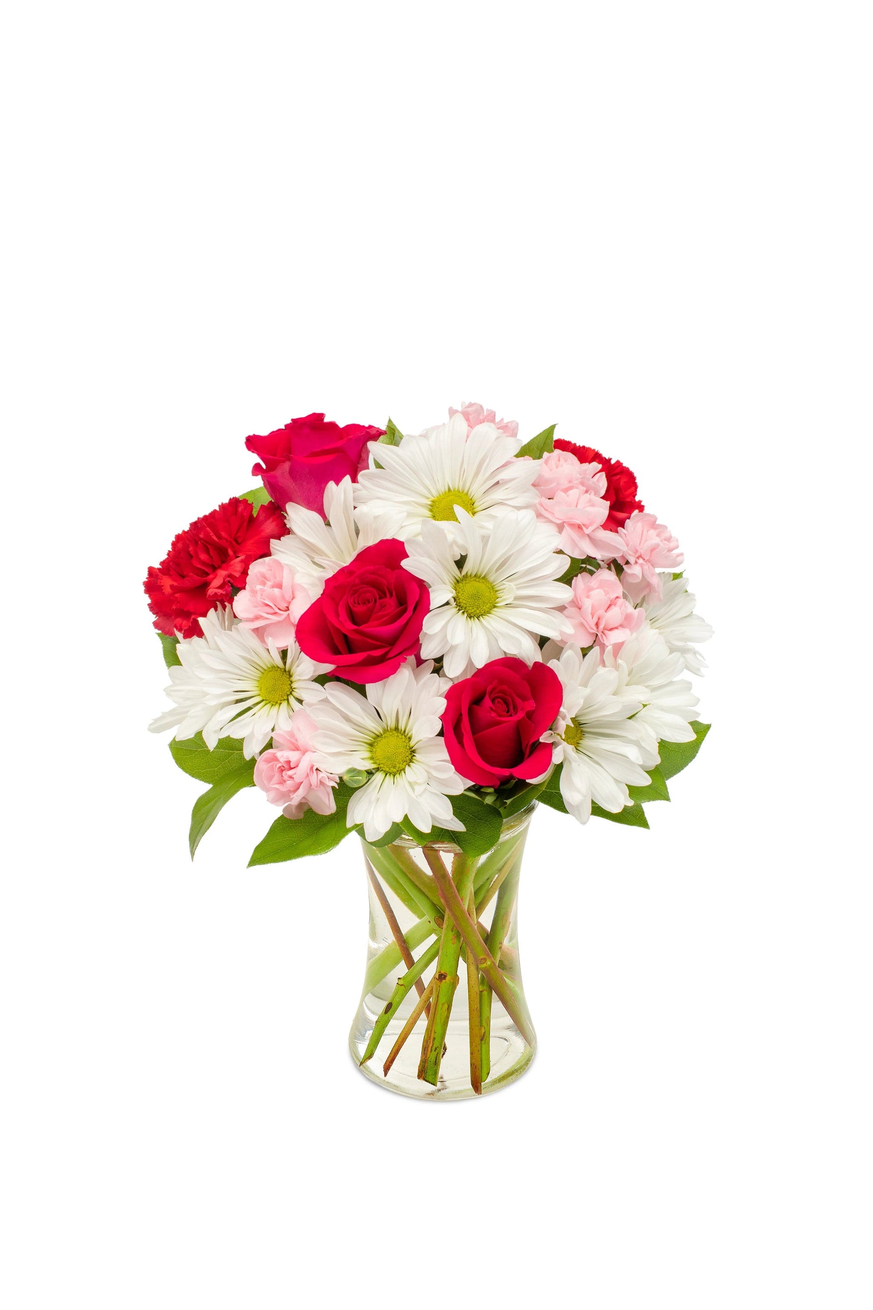 ¿Cómo podrías decirlo mejor? Dile que es la persona más dulce y prepárate para recibir un montón de agradecimientos y besos cuando tu persona especial se fije en este cautivador ramo de margaritas, rosas y claveles en un jarrón transparente.