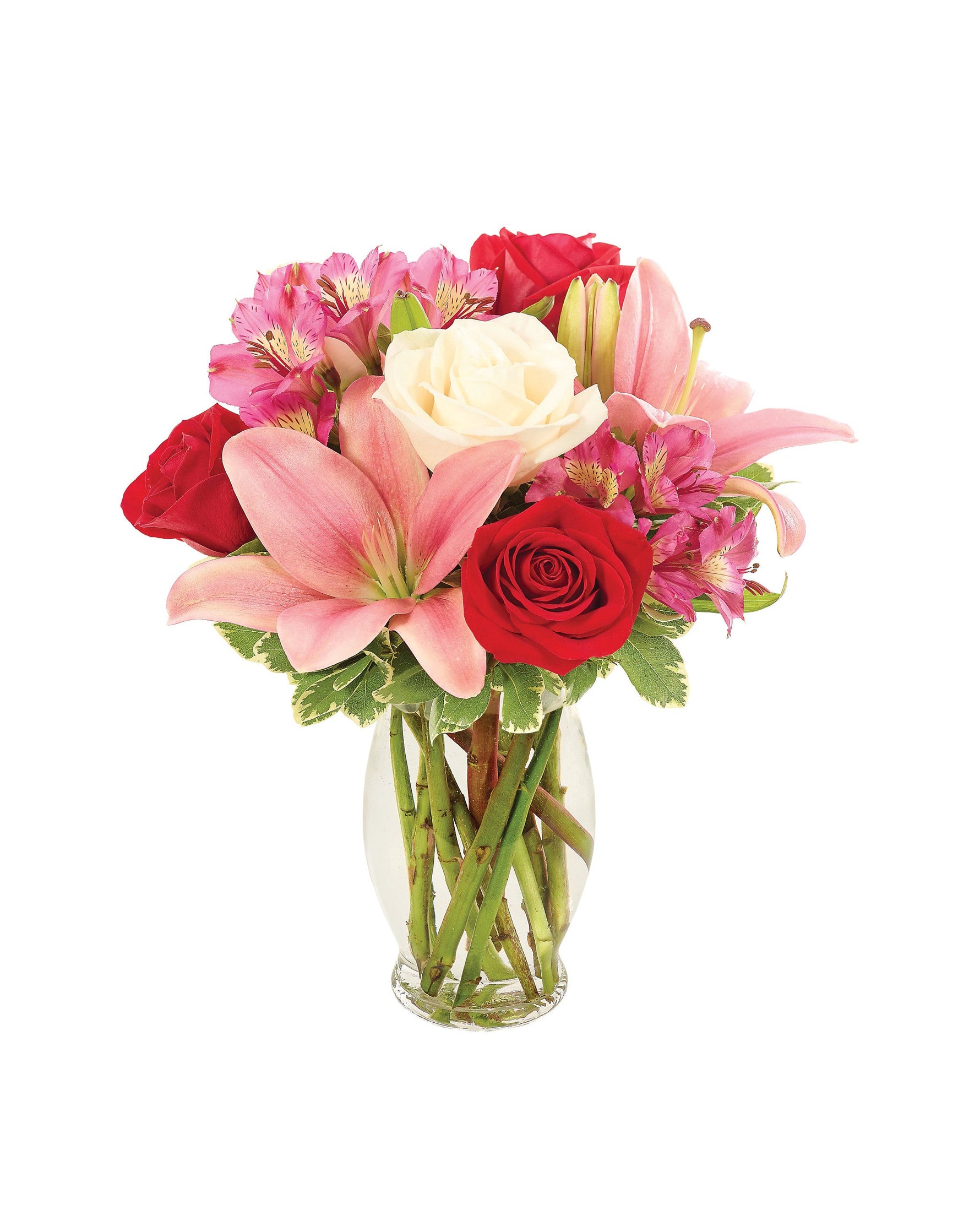 Sí, el amor está en el aire y en el corazón de ambos, tú y tu ser querido, al compartir este precioso ramo de San Valentín. Lirios asiáticos, rosas y alstroemerias se combinan a la perfección, con gran gracia, en un jarrón transparente acanalado.