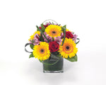 Precio unitario / porEl jarrón cúbico forrado con hojas de Ti le da un toque moderno a este arreglo clásico de gerberas, rosas y alstroemerias, creando el regalo perfecto para un cumpleaños o una ocasión cotidiana.