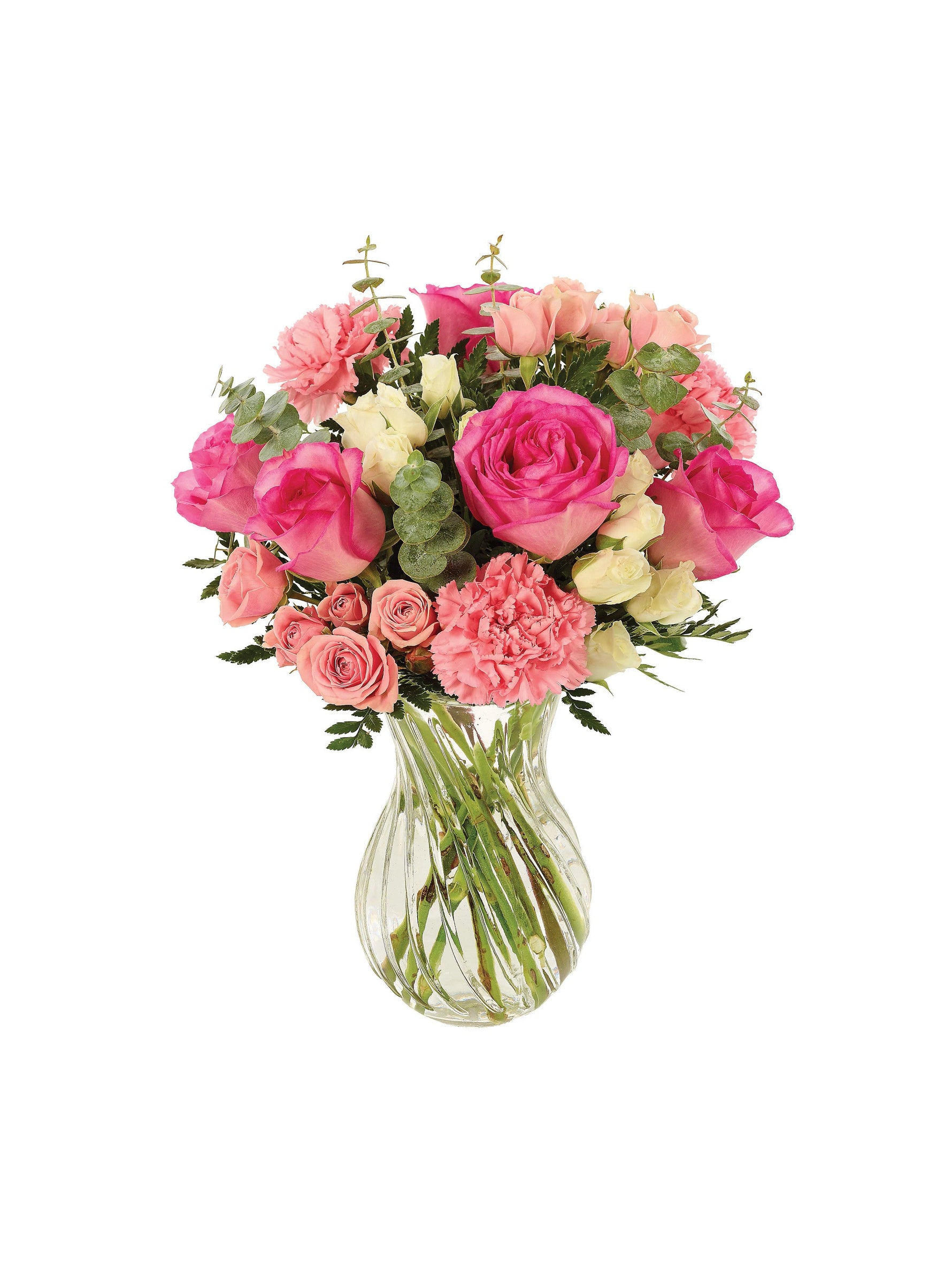 Mamá seguramente invitará a todas sus amigas a ver este brillante y hermoso ramo, y luego observará con alegría cómo sus rostros envidiosos se dibujan en sus rostros. Rosas, claveles pequeños y eucaliptos se presentan con imaginación en un florero de vidrio con espirales.