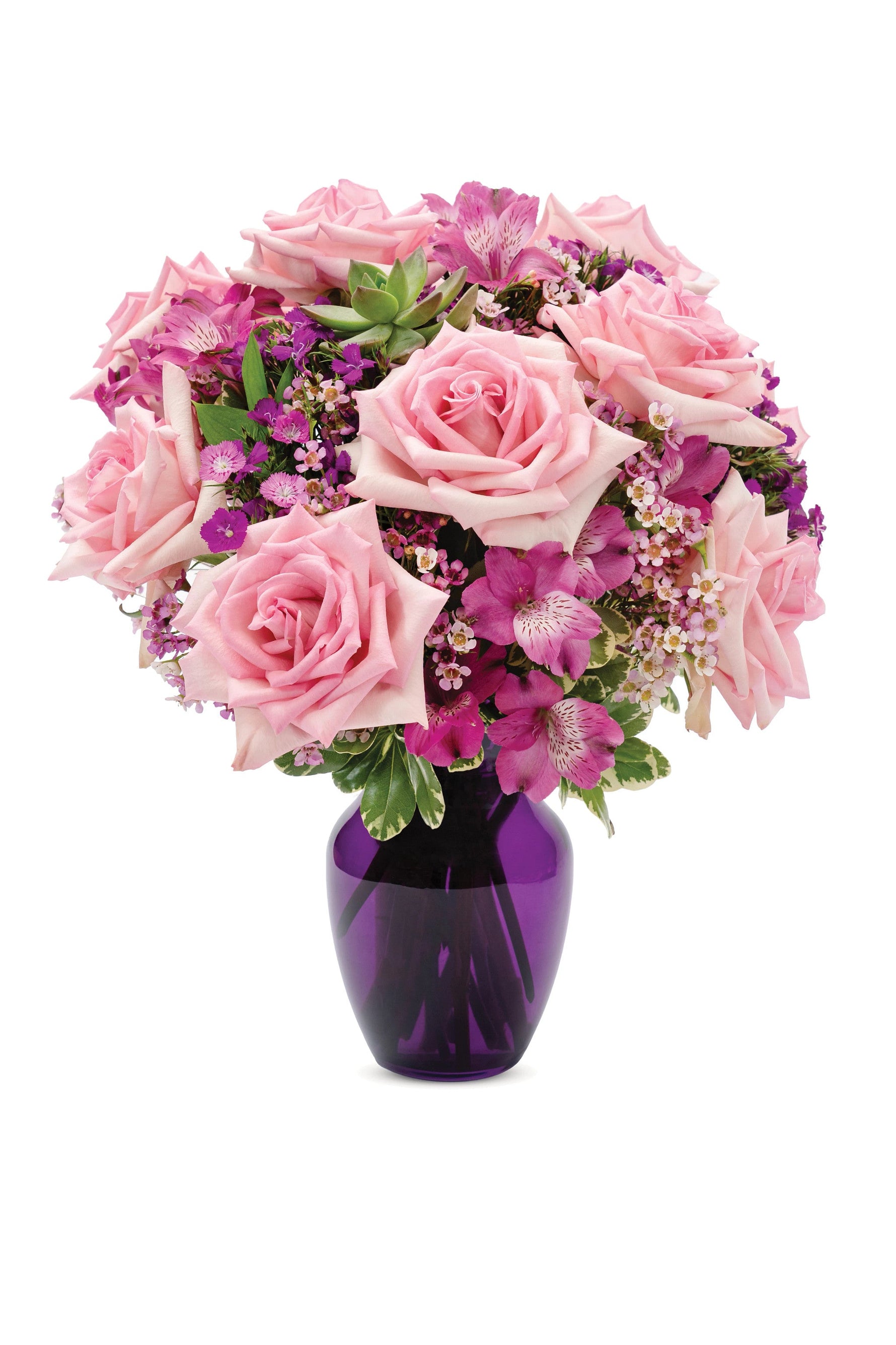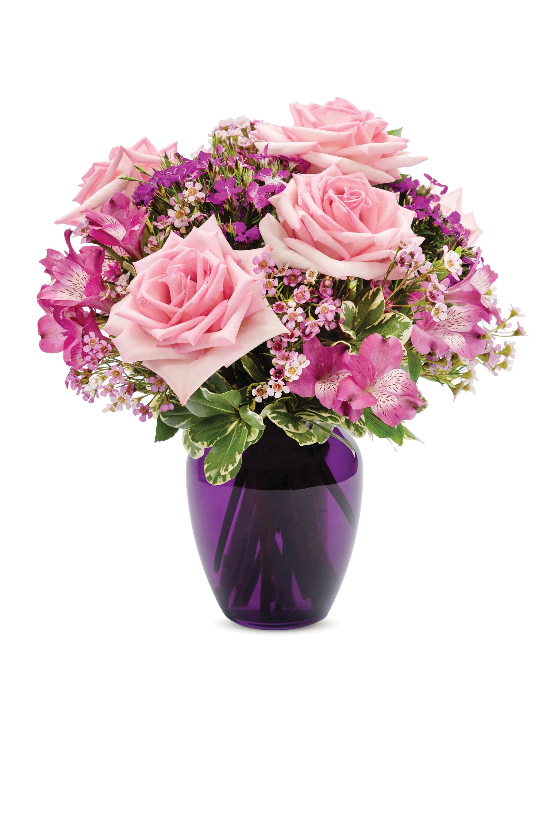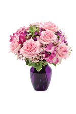 Hazles saber lo que realmente sientes con este impresionante ramo de rosas rosadas, alstroemerias moradas, claveles morados y flores de cera rosadas en un jarrón de color morado real.