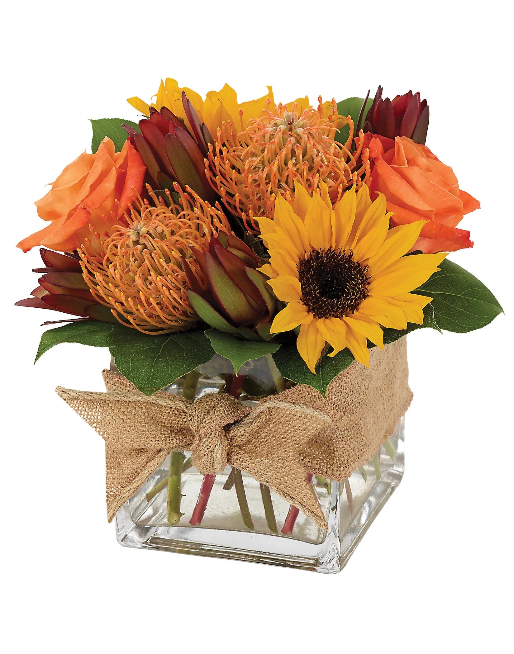 La Madre Naturaleza se ha superado una vez más. Esta abundante celebración floral del otoño incluye dos gloriosos girasoles, rosas, proteas y leucadendros en un elegante recipiente cúbico de vidrio. Para completar la celebración, una llamativa cinta de arpillera.