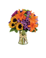 Una reencarnación absolutamente hermosa de un tranquilo paisaje rural. Esta elegante creación de magnificencia floral contiene girasoles, margaritas burdeos, lirios asiáticos naranjas, pompones verdes, alstroemerias moradas y estátice morado en un jarrón transparente con un lazo de rafia natural.