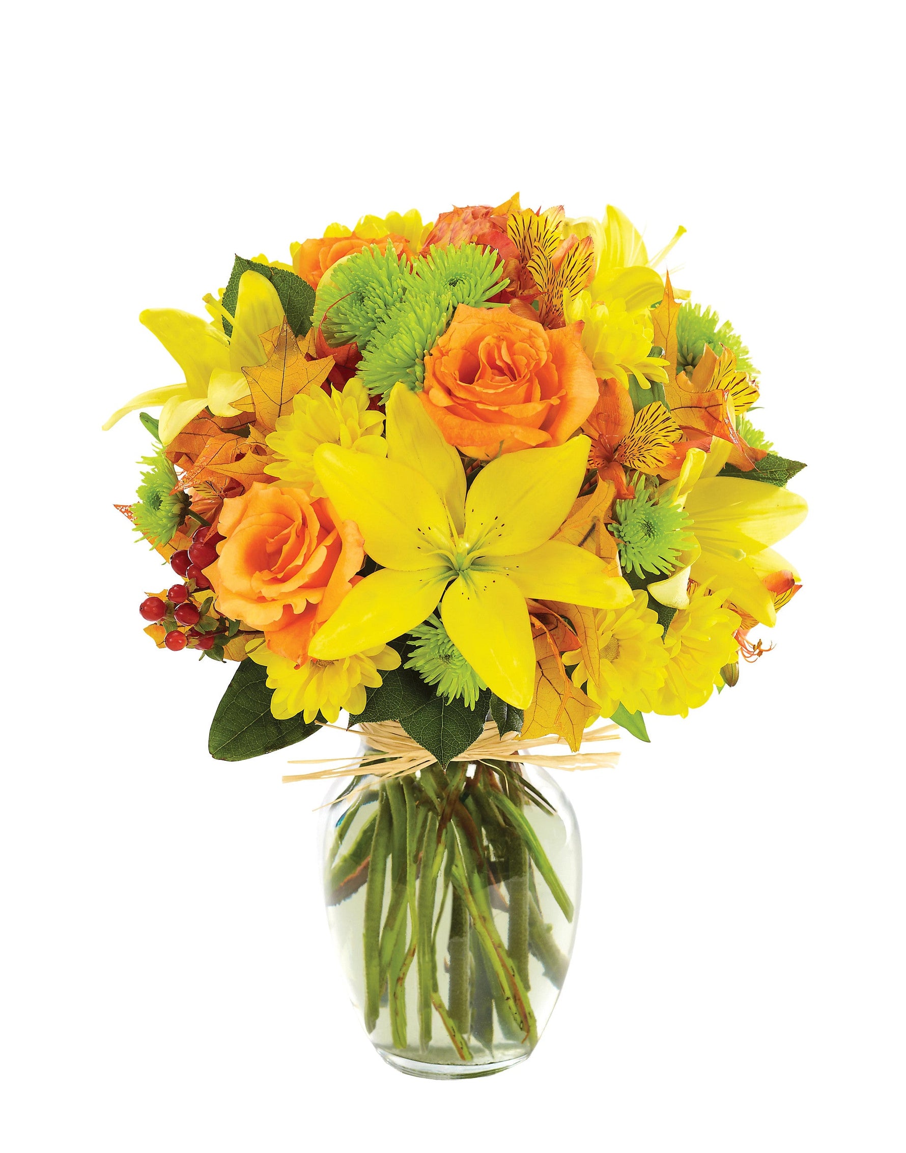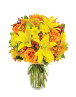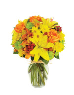 ¡Tres hurras por la que quizás sea la cosecha más hermosa que jamás hayas visto! Lirios amarillos, margaritas naranjas, alstroemerias amarillas, rosas naranjas, pompones Athos e hipérico rojo llenan un elegante jarrón de rosas para crear un arreglo incomparable.