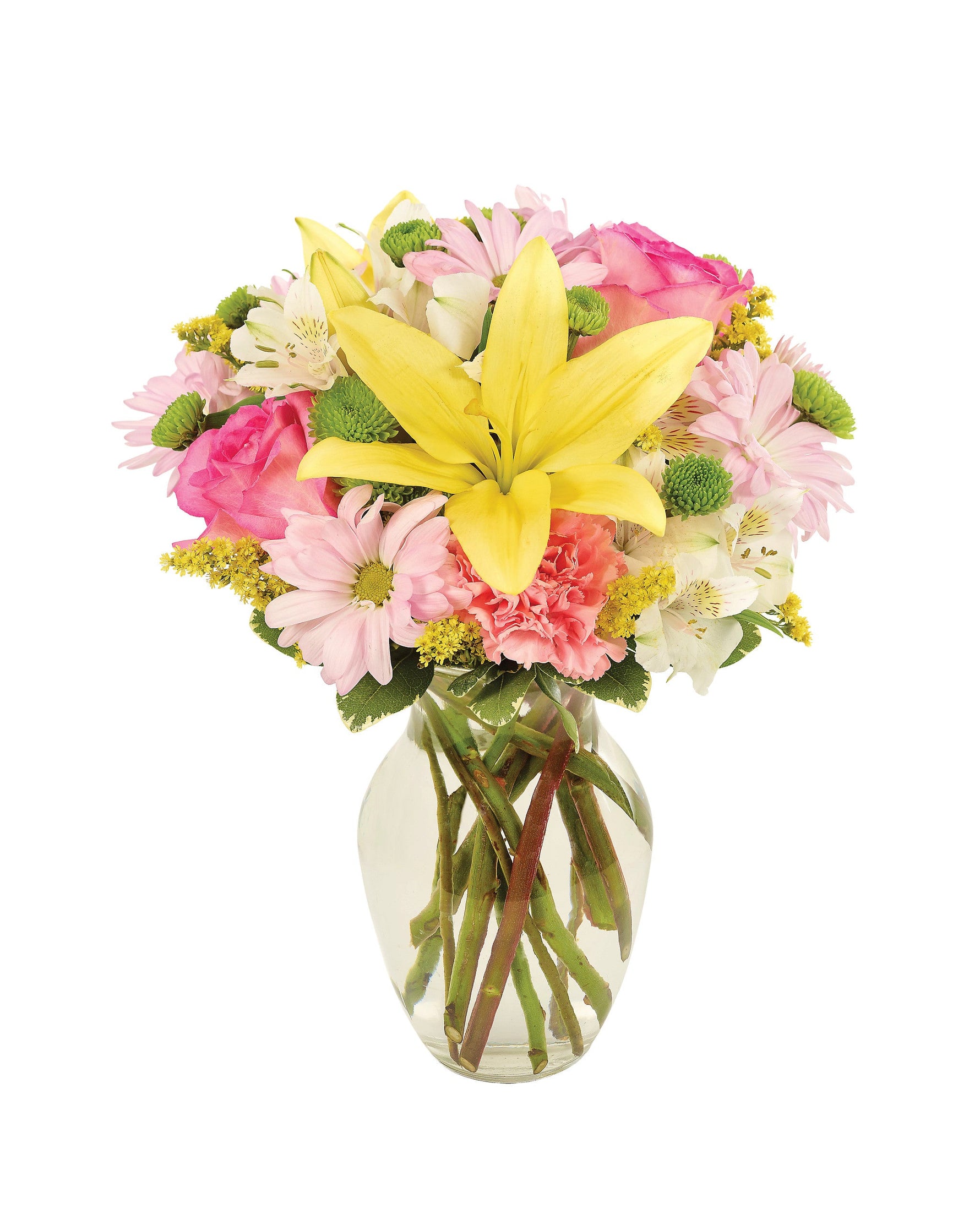 Precio unitario / porUn alegre y brillante lirio asiático amarillo expresa su belleza en este alegre ramo, perfecto para el Día de la Madre. Complementa el lirio con rosas, alstroemerias, claveles, solidagos, pompones y margaritas, todo presentado con maestría en un florero transparente.