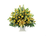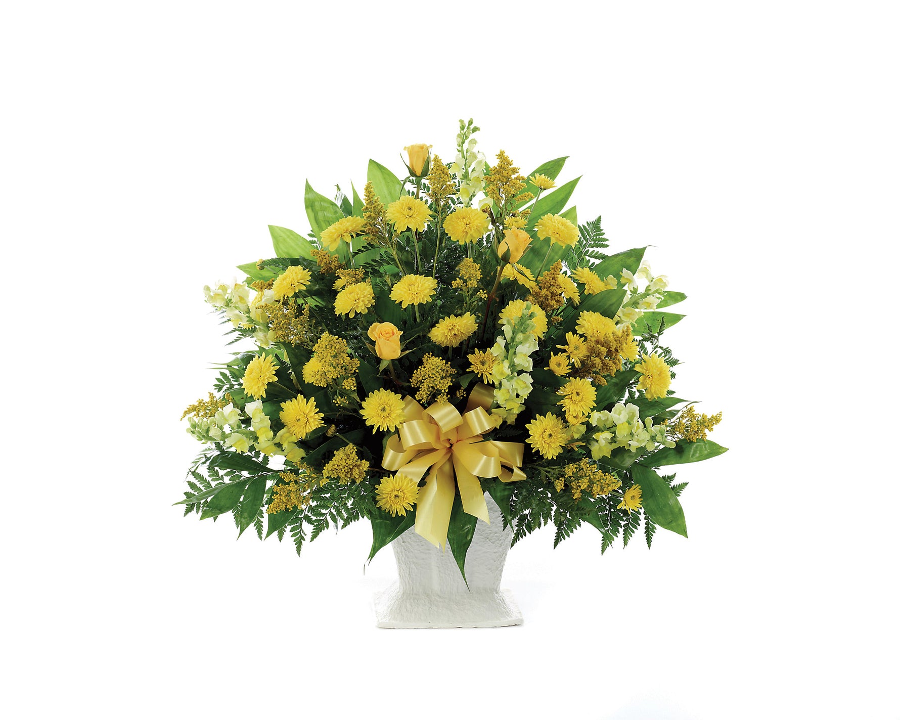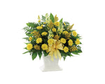Exprese su simpatía de una manera muy considerada con este elegante arreglo de boca de dragón amarilla, crisantemos y solidago en un recipiente blanco clásico con una cinta amarilla.