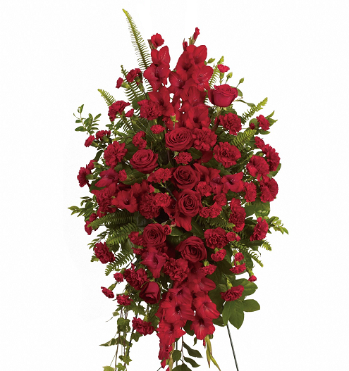 Este rico y radiante ramo de rosas rojas, claveles y otras flores rojas populares, ideal para momentos de pérdida, transmite un mensaje de consuelo y esperanza en tiempos difíciles. Caballete no incluido.