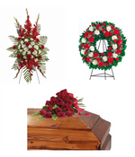Este paquete de flores de condolencias incluye un arreglo floral para ataúd, una corona de condolencias y un arreglo floral para condolencias. Una generosa y suntuosa combinación de claveles rojos y blancos y rosas rojas crea un magnífico homenaje a su ser querido. No incluye caballetes.
