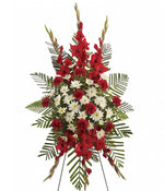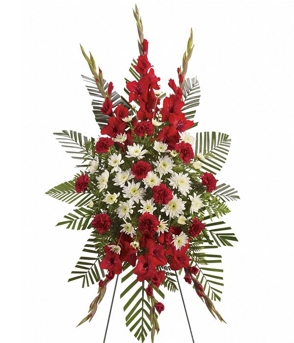 Expresa tu amor con belleza y buen gusto con este impresionante arreglo floral rojo y blanco. Una elección impecable para el servicio conmemorativo. Caballete no incluido.