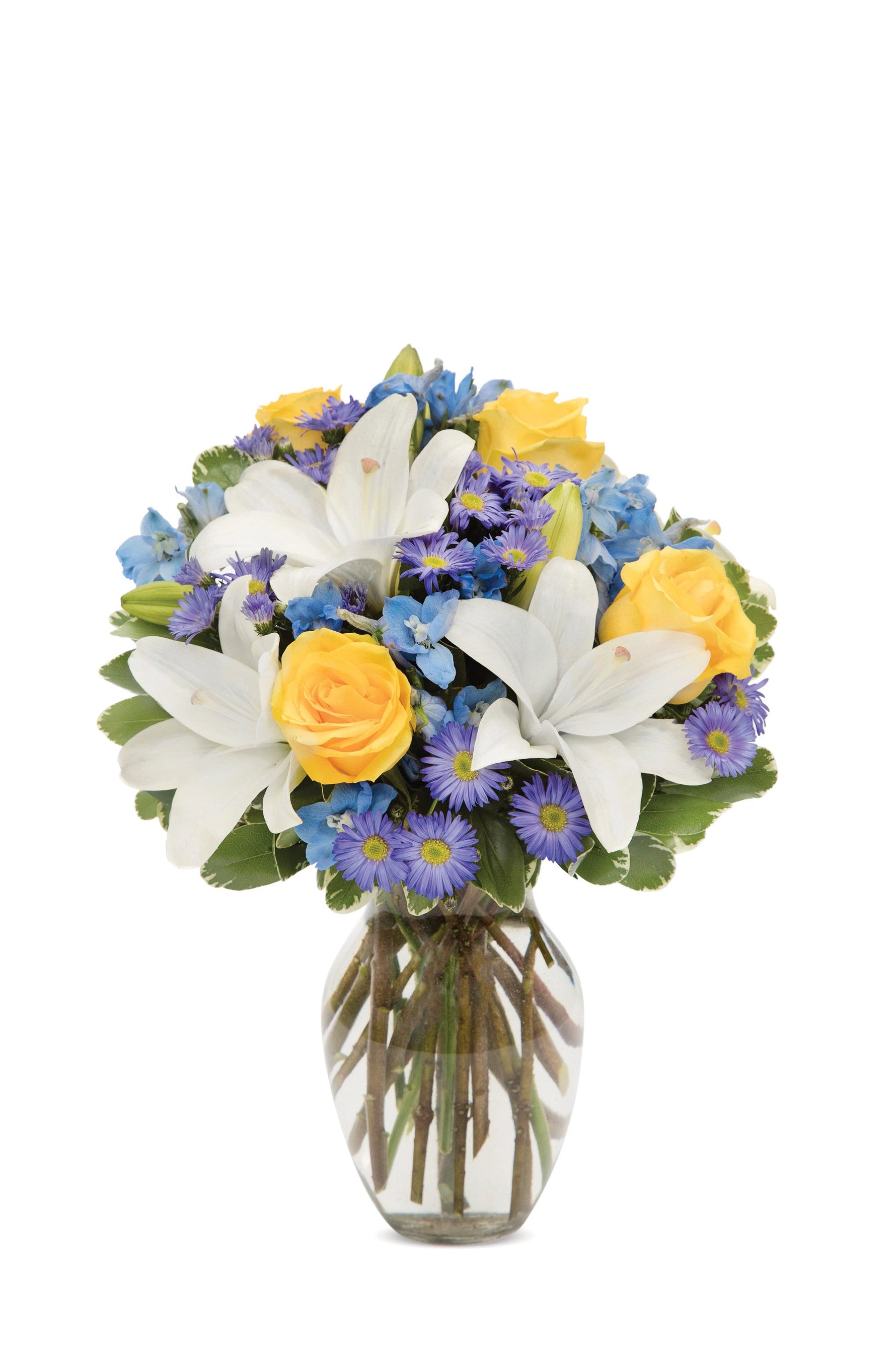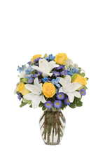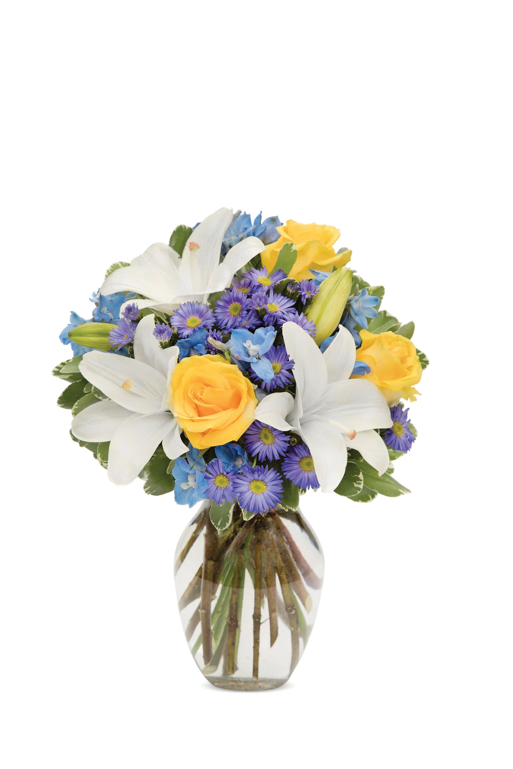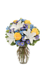 Los hermosos lirios asiáticos blancos captan tu atención de inmediato, pero solo comienzan a contar la historia de este ramo único y hermoso que también cuenta con rosas amarillas, delphinium azul claro y flores de Monte Casino púrpuras... todos dispuestos de manera creativa en un jarrón estriado con una cinta de raso azul.
