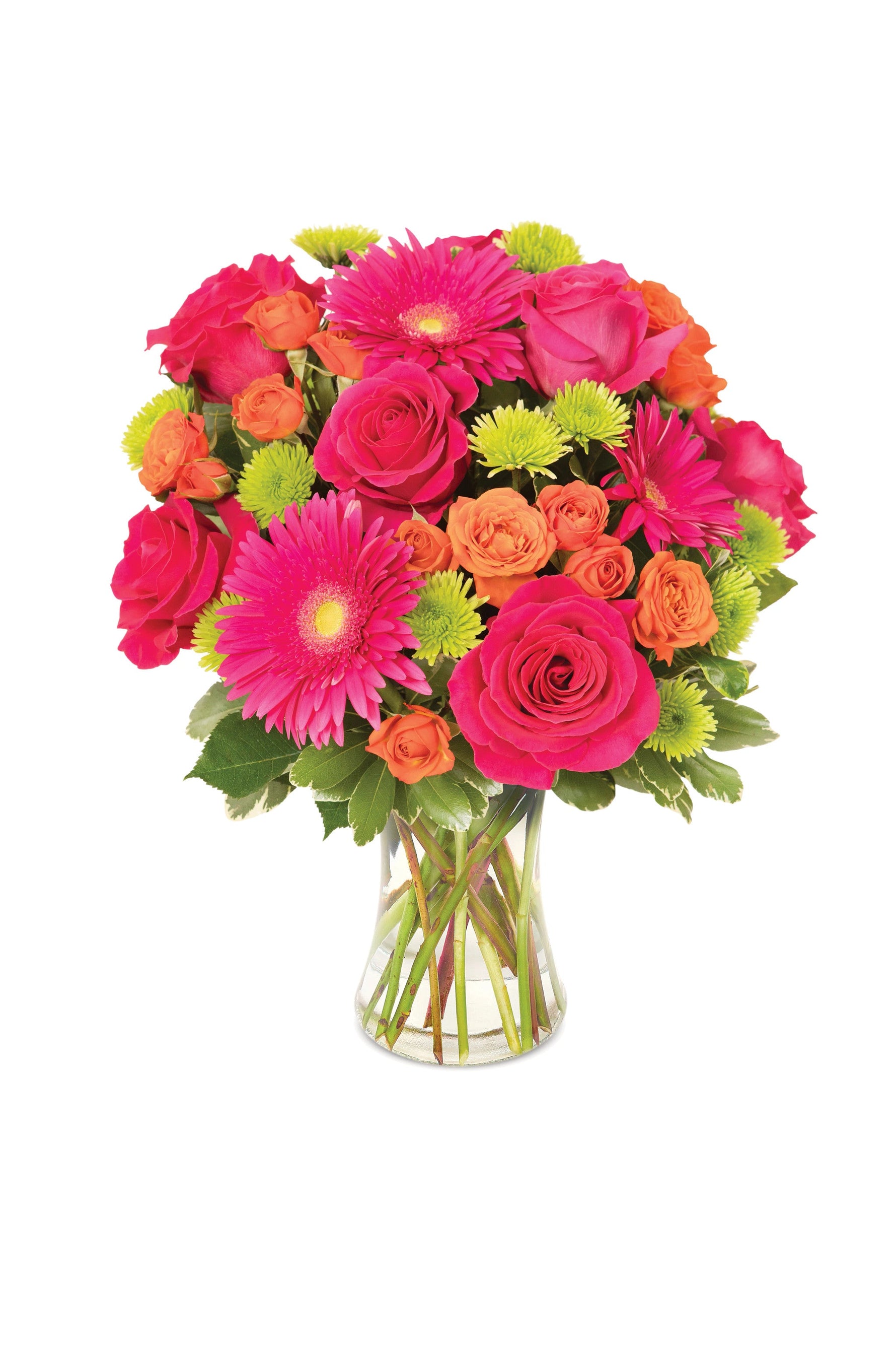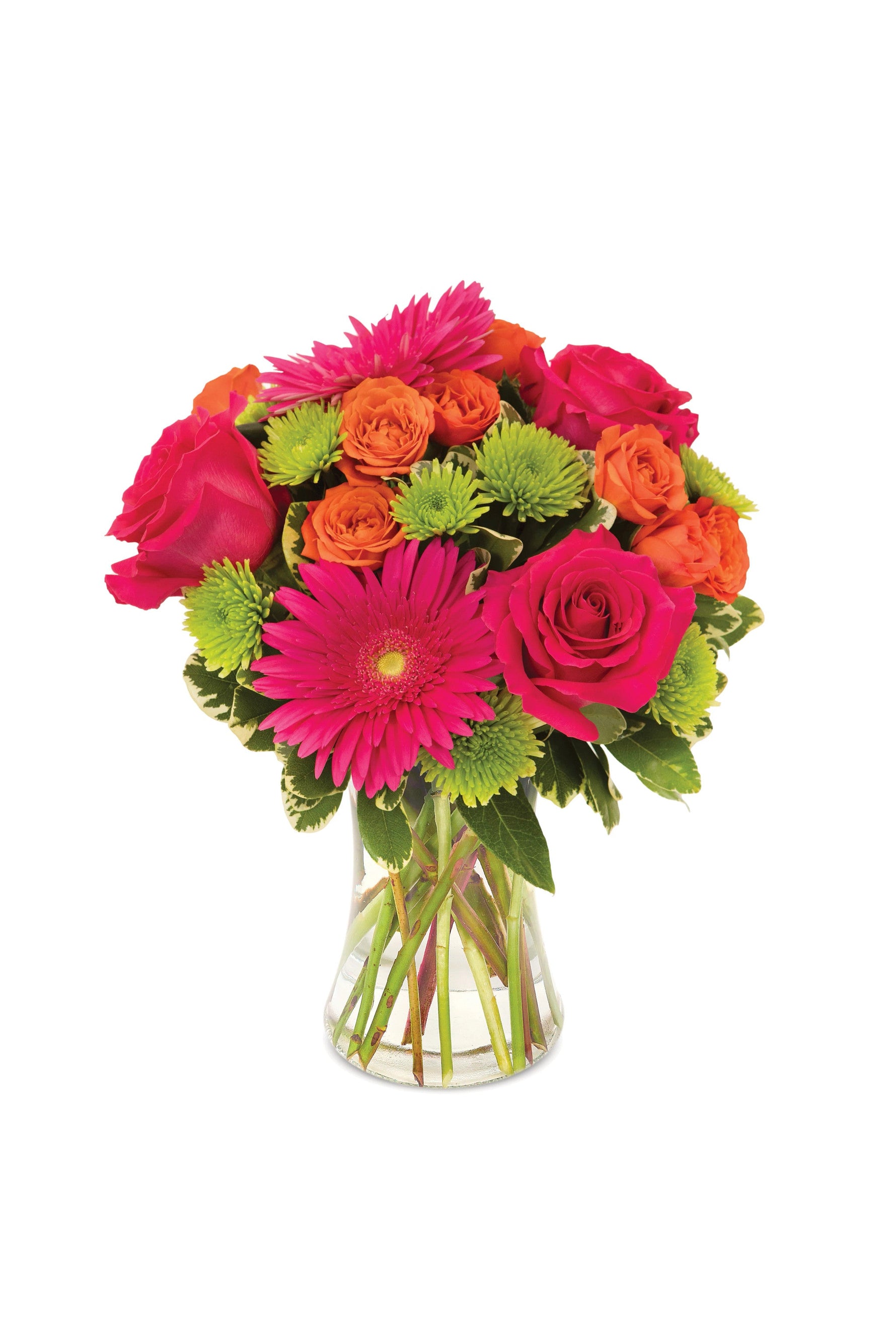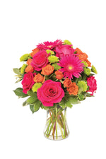 Los colores brillantes y vivaces hacen que este increíble ramo sea irresistible y, sin duda, un tesoro. Un elegante jarrón transparente crea el ambiente perfecto para una vibrante combinación de gerberas, rosas multicolores, athos y pitósporo.