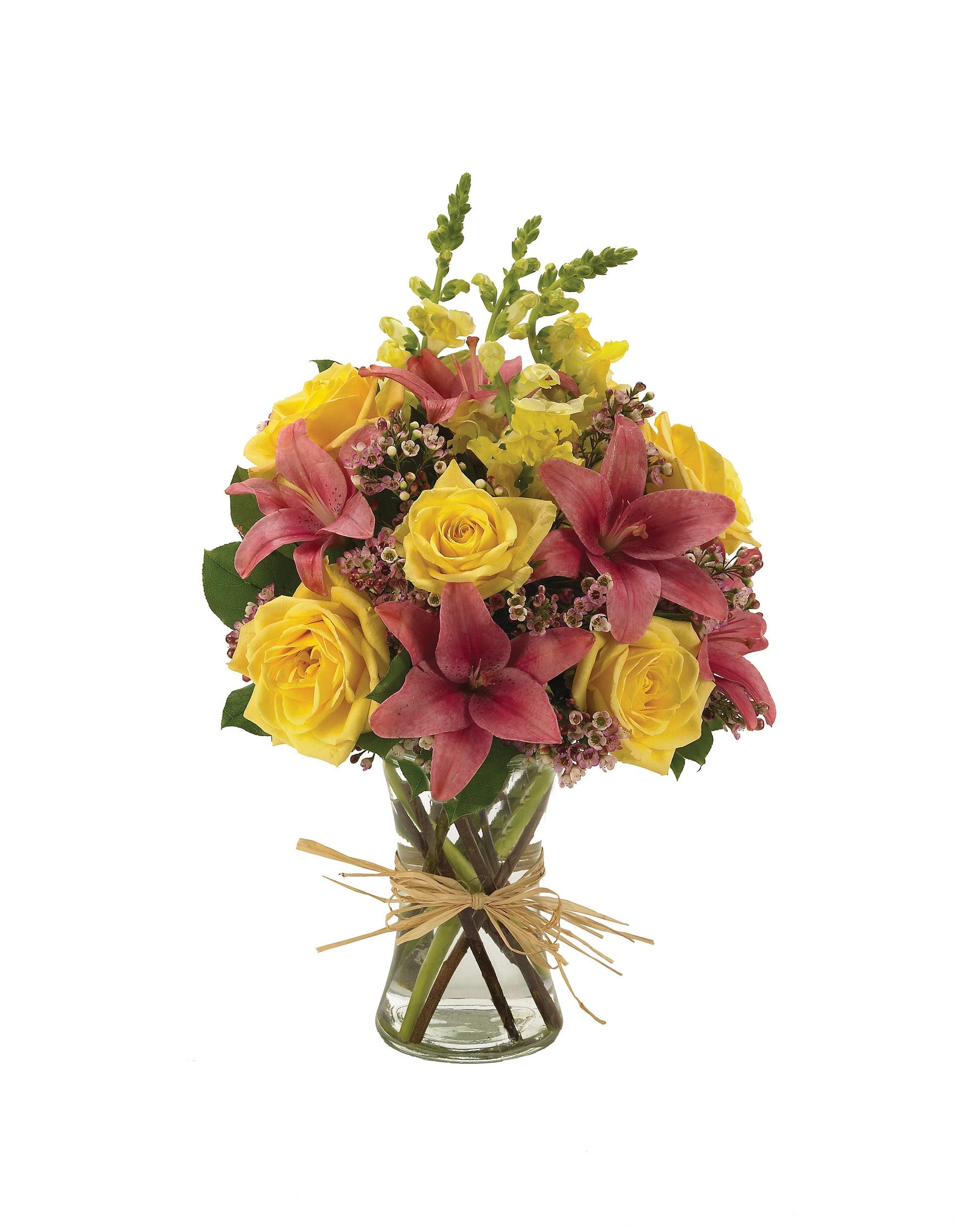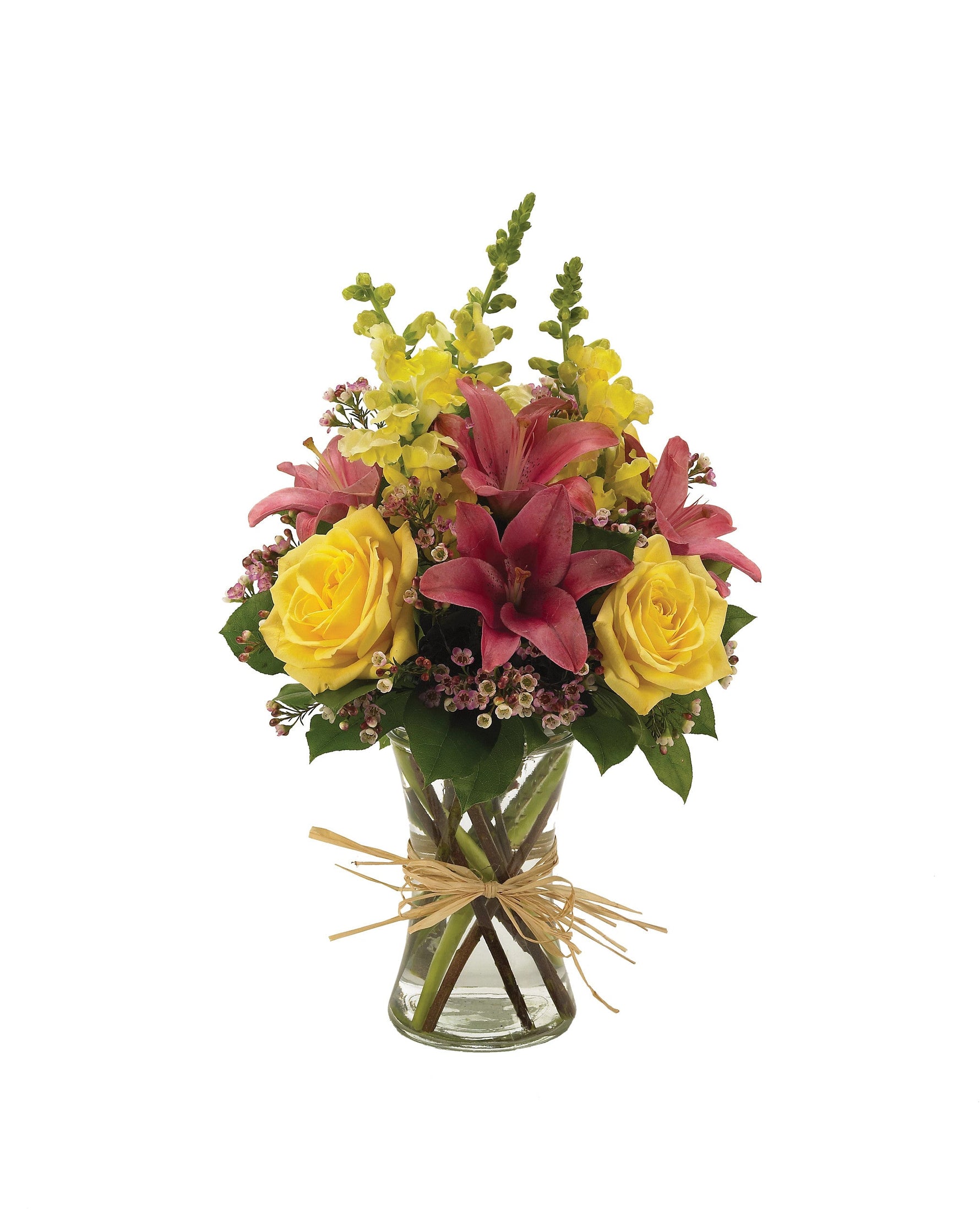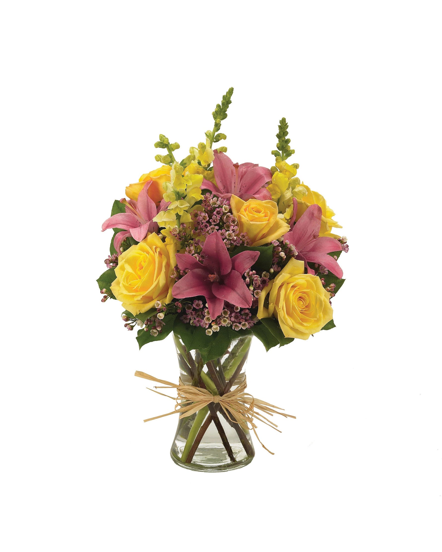 Le encantará, y te agradecerá que se lo hayas regalado. Este delicado arreglo floral incluye lirios asiáticos rosas, bocas de dragón amarillas, rosas amarillas y flor de cera rosa, bellamente presentados en un florero transparente.