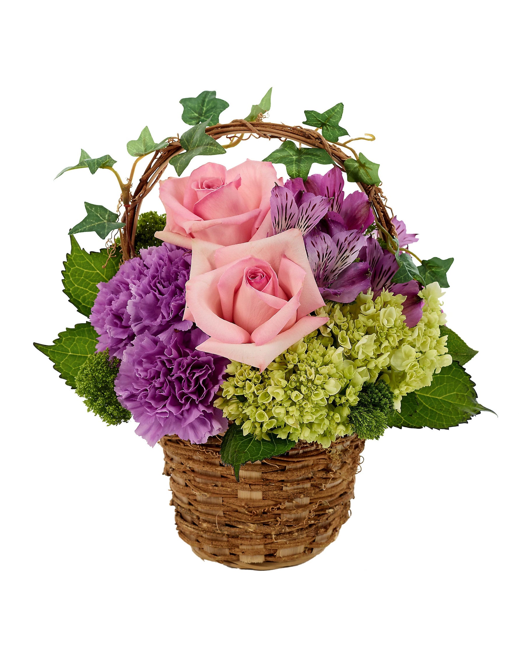 ¿No te imaginas paseando por un jardín campestre rodeado de las vistas y el aroma de hermosas flores? Este arreglo evoca esos pensamientos, con rosas rosas, mini hortensias, claveles morados, alstroemerias moradas y un toque verde en una cesta tejida con detalles de hiedra.