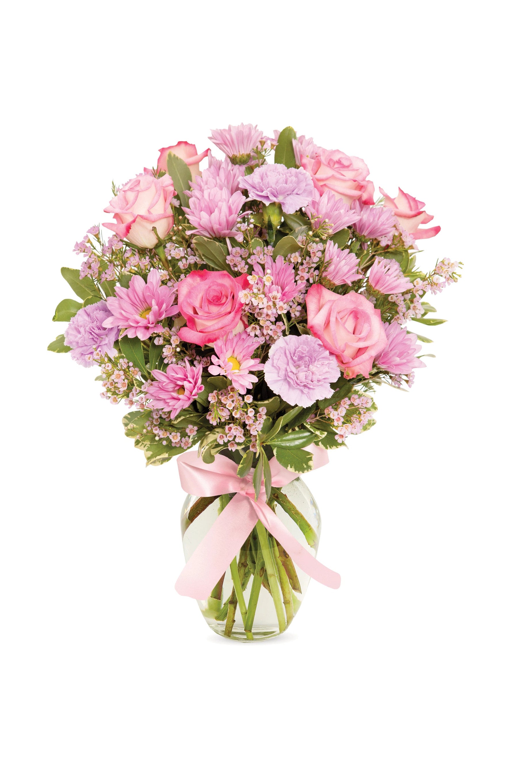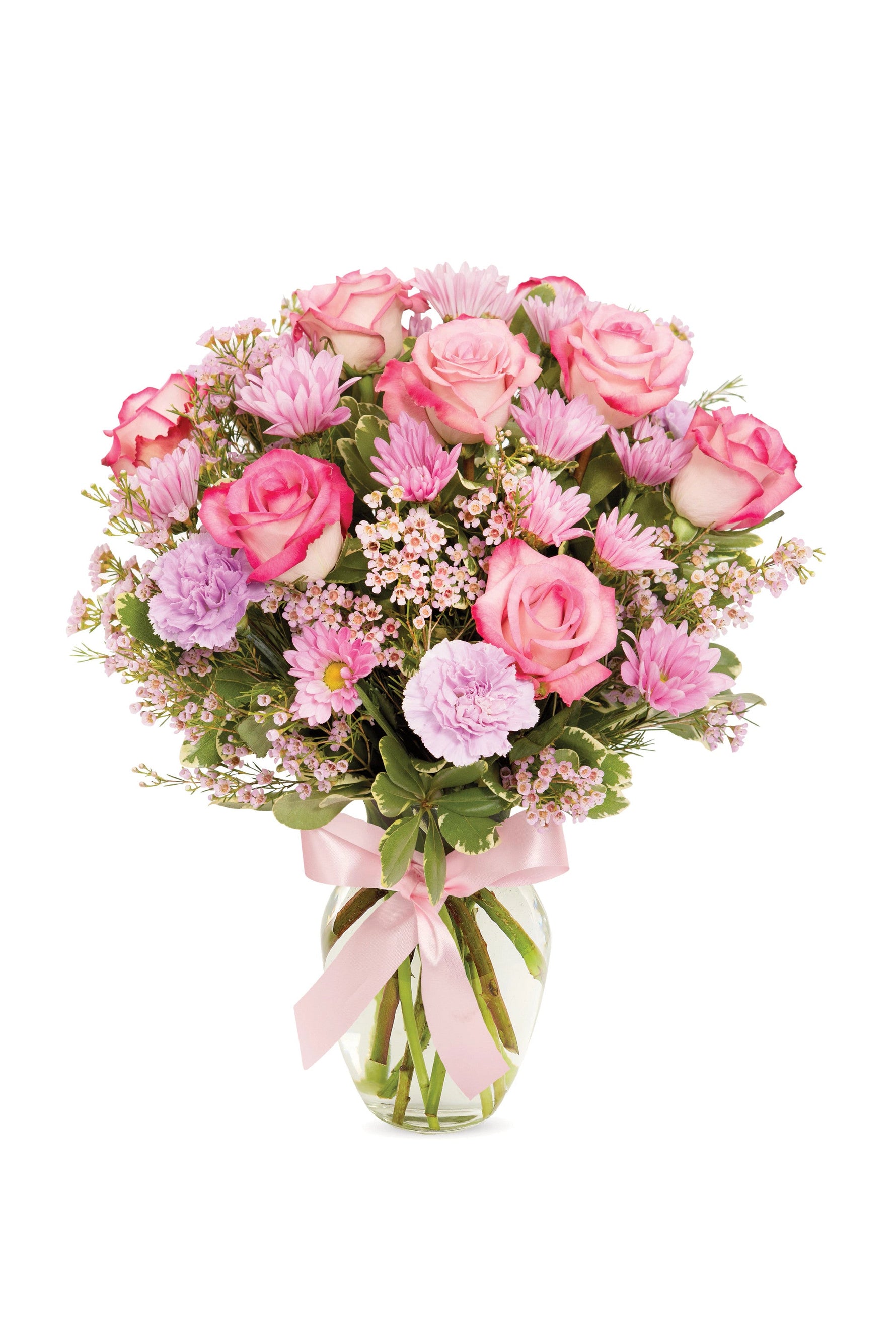 Una magnífica combinación de hermosas flores y un elegante toque de estilo hacen de este ramo la manera ideal de expresar amor. Rosas, margaritas, flor de cera, claveles y pitósporo se mezclan en un jarrón transparente adornado con un bonito lazo rosa.