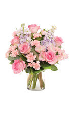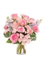 Nada conmueve tanto como un ramo de flores frescas bellamente arreglado. El corazón de quien lo reciba se llenará de amor al contemplar esta excepcional combinación de rosas, alstroemerias, claveles mini, eucalipto y salal en un jarrón transparente.