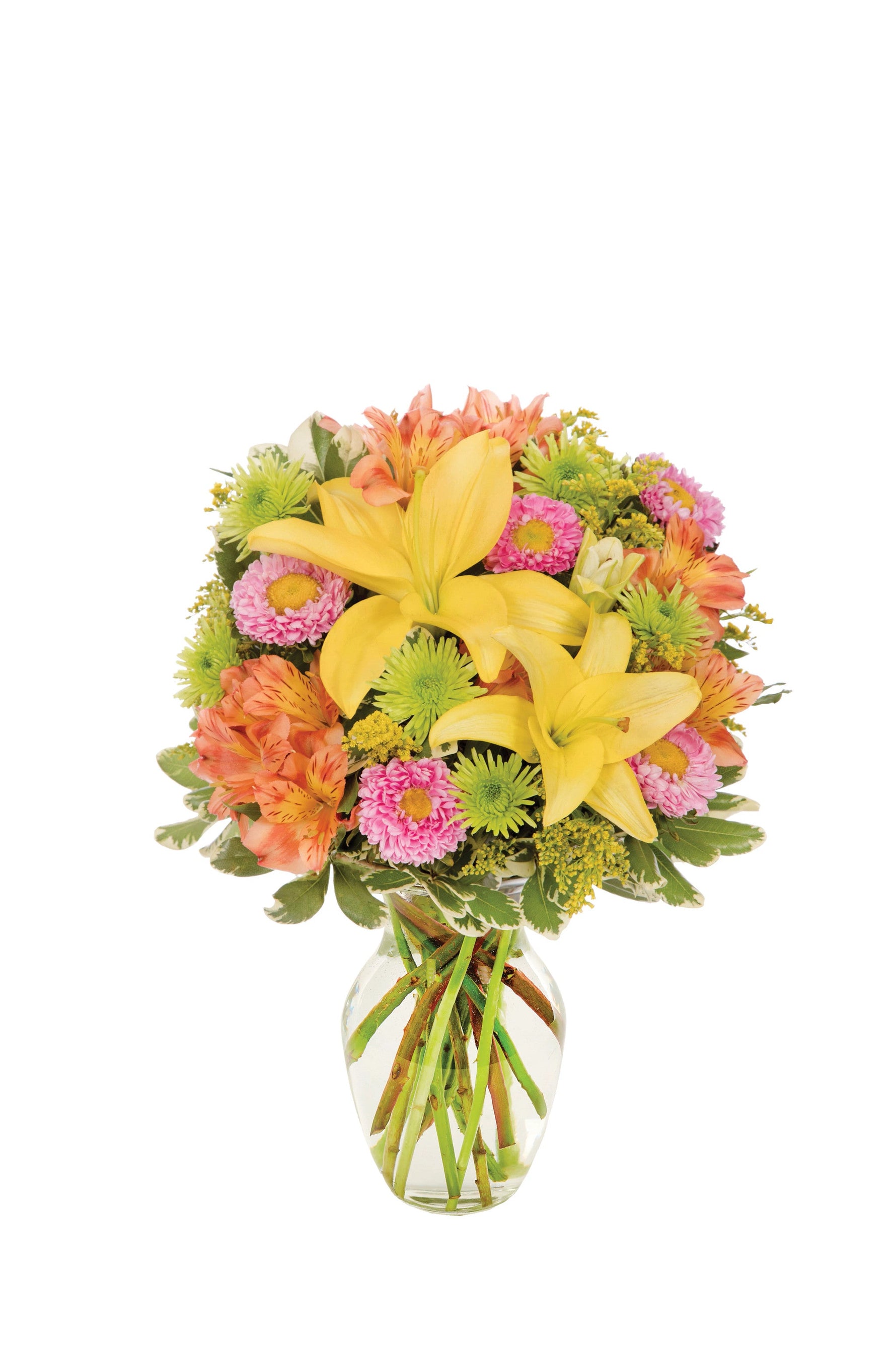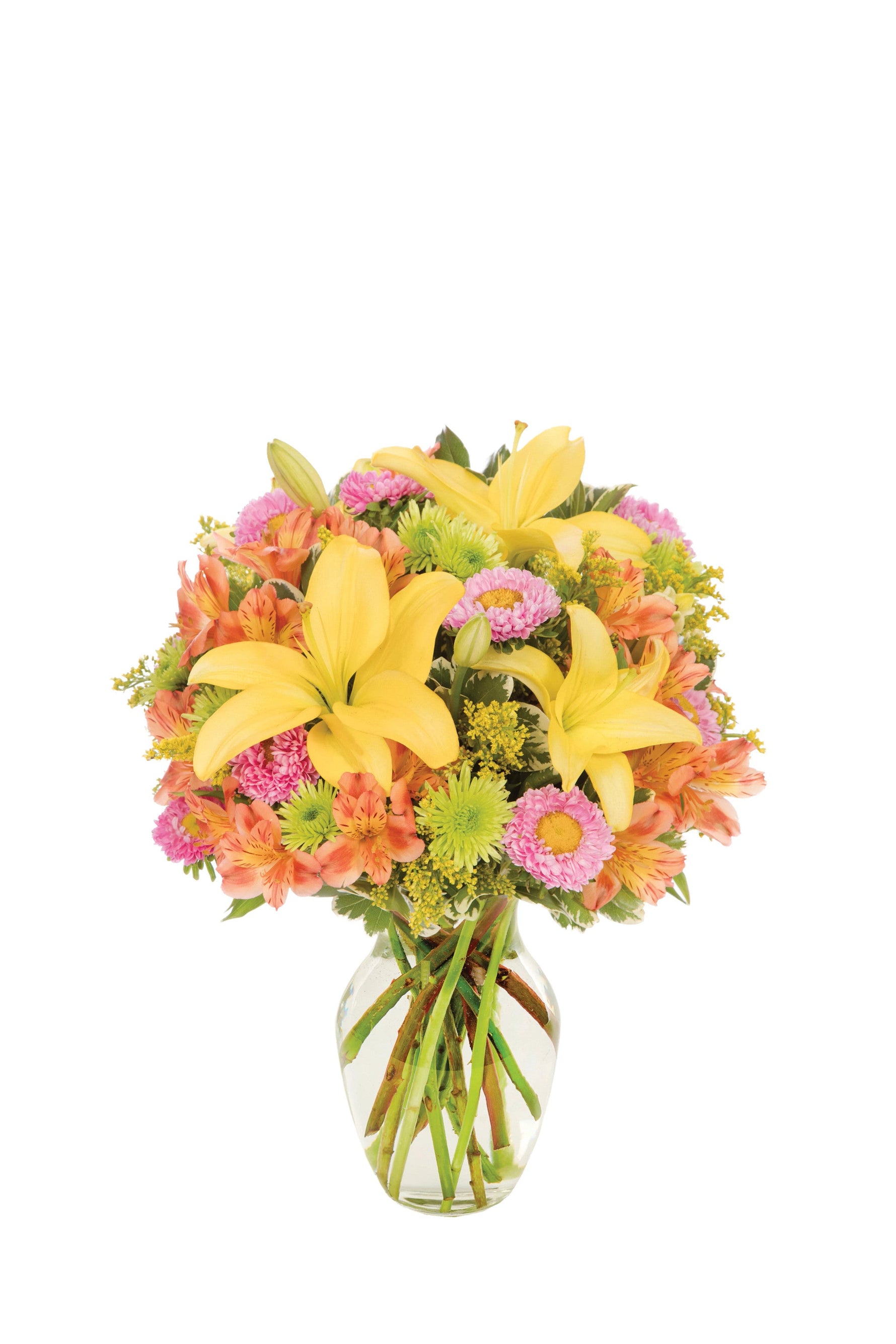 Cierra los ojos e imagina un pintoresco amanecer que brilla con fuerza en una mañana despejada. Esa es la sensación que transmite este encantador arreglo de lirios asiáticos, alstroemerias, solidago, athos, áster Matsamoto y pitósporo en un jarrón transparente.