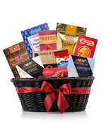 La cesta de regalo "Blue Ribbon" contiene doce (12) artículos gourmet e incluye cualquier combinación de las siguientes delicias gourmet: galletas de chocolate crujiente, almendras tostadas, galletas de chocolate con caramelo salado, caramelo de agua salada, galletas belgas caramelizadas, café estilo europeo Wolfgang Puck, chocolate con leche Lindt Lindor, galletas de agua con mezcla de tres pimientas, ostras ahumadas con madera noble en aceite de girasol, mezcla de café latte barista, trufas belgas, trufas de chocolate negro, té Highland Select, galletas de mantequilla dulce, pralinés de chocolate Baci, atún de agua dulce salvaje, queso cheddar suave de Quebec, galletas Graham cubiertas de chocolate, nuggets de pan de masa madre con mostaza y miel del valle de Napa, galletas de obleas de chocolate, queso OKA, caramelo Roca de almendras, salmón rosado salvaje del Pacífico, caramelos de frutas California Rail, galletas de trufa Primo Dolce, queso cheddar canadiense Balderson Royal, biscotti de chocolate Milano, barras de chocolate negro y chocolate negro Lindt Excellence DARK.