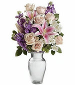 Sin duda, será la envidia de sus amigas cuando vean este encantador ramo de rosas y lirios rosados ​​en un elegante jarrón de cristal... Y disfrutará cada momento. El encantador ramo incluye rosas rosa claro, lirios orientales rosados, alstroemerias blancas y flores de lavanda, con toques de pitósporo variegado. Se entrega en jarrón de cristal.