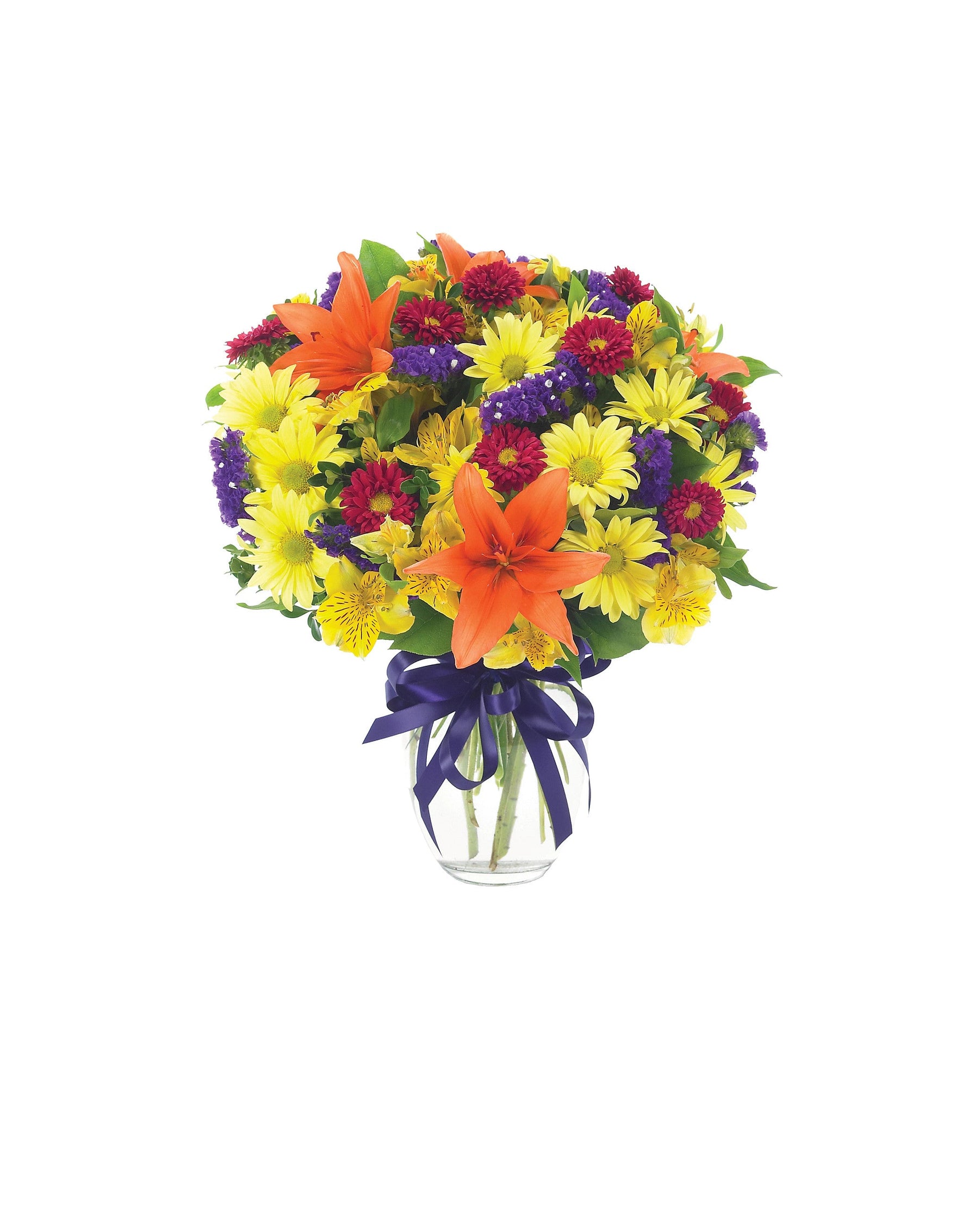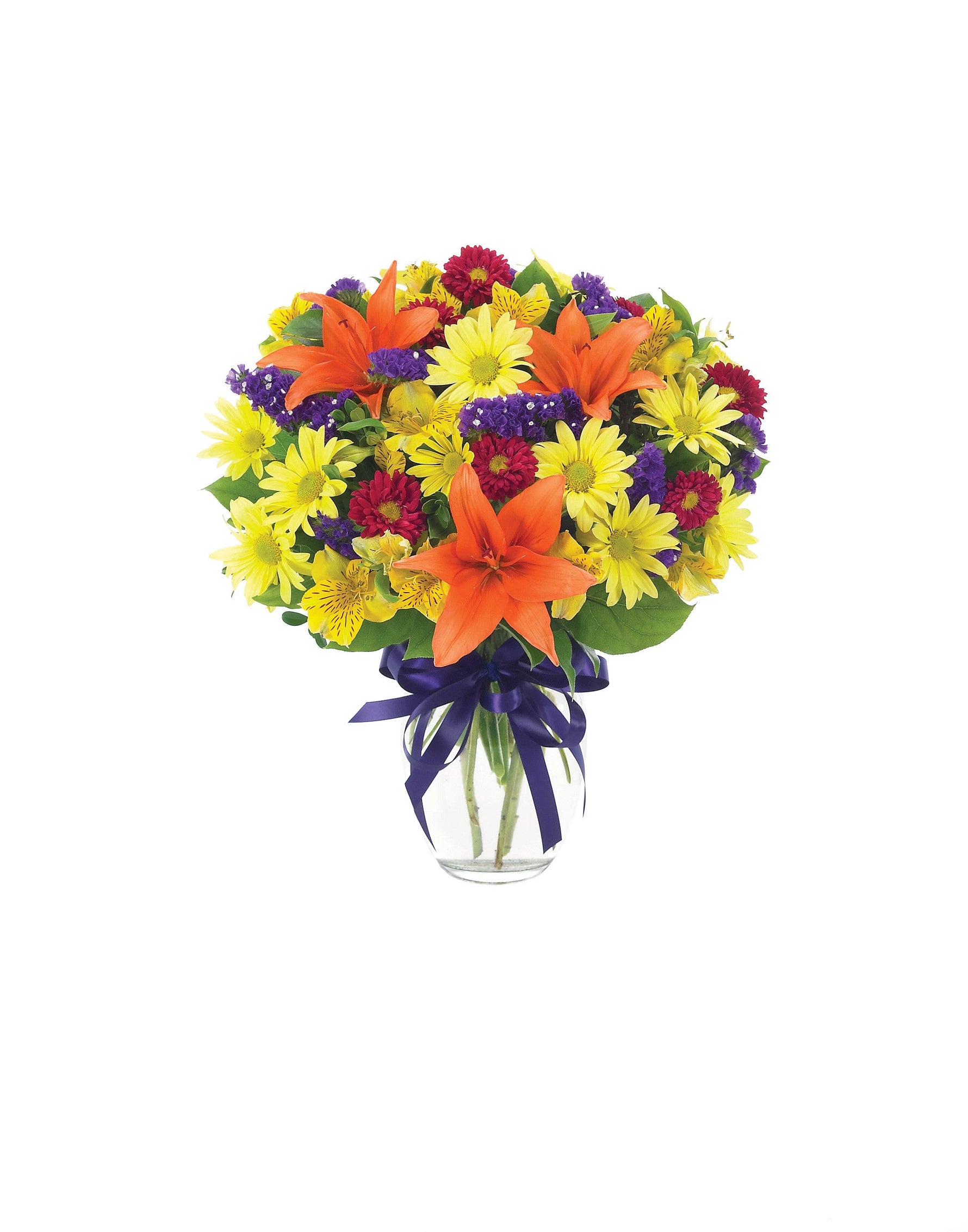Diles cuánto significan para ti, ahora y siempre. Esta preciosa mezcla de lirios, margaritas, pompones, alstroemerias, estátice y ásteres se complementa a la perfección con un jarrón transparente con una cinta de organza morada.