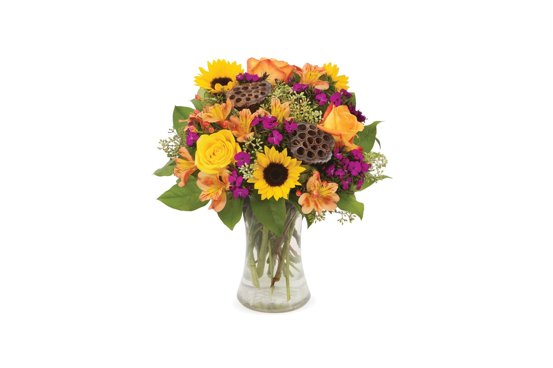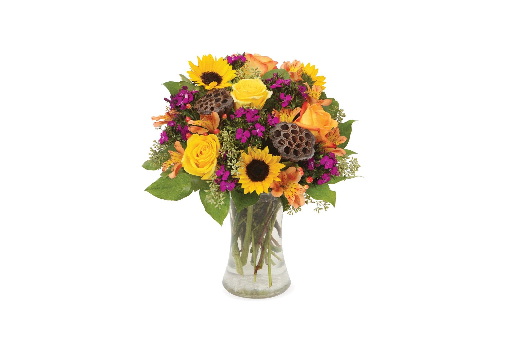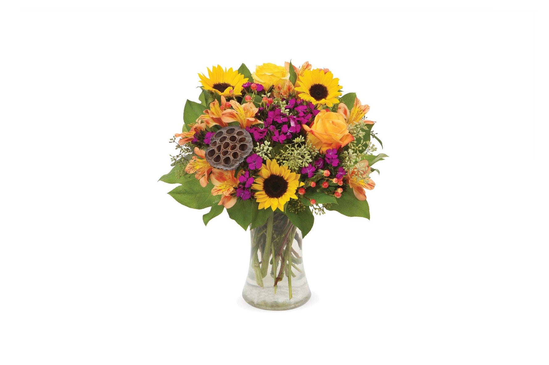 Exprese las emociones perfectas para casi cualquier ocasión de obsequio de otoño con esta colorida mezcla de rosas, girasoles, claveles, hipericum, alstroemerias y eucaliptos exhibidos espectacularmente en un jarrón transparente.