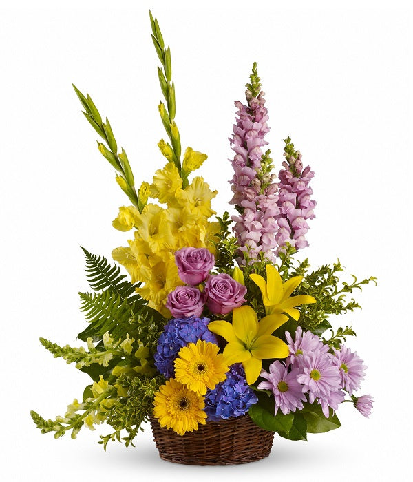 Esta generosa canasta es una forma preciosa de enviar pensamientos cariñosos y deseos de un futuro mejor. Hermosas flores como rosas lavanda, bocas de dragón y crisantemos con ramilletes de margaritas, junto con lirios asiáticos amarillos, gerberas, gladiolos, bocas de dragón y follaje brillante se entregan en una encantadora canasta de mimbre.