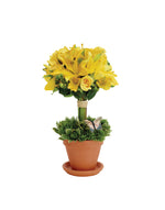 Únicamente innovadora y con seguridad cosechará elogios de su destinatario, esta maravillosa creación floral incluye lirios asiáticos amarillos, alstroemerias amarillas, trachelium verde, hipericum verde y rosas amarillas en una maceta de terracota con una mariposa divertida.