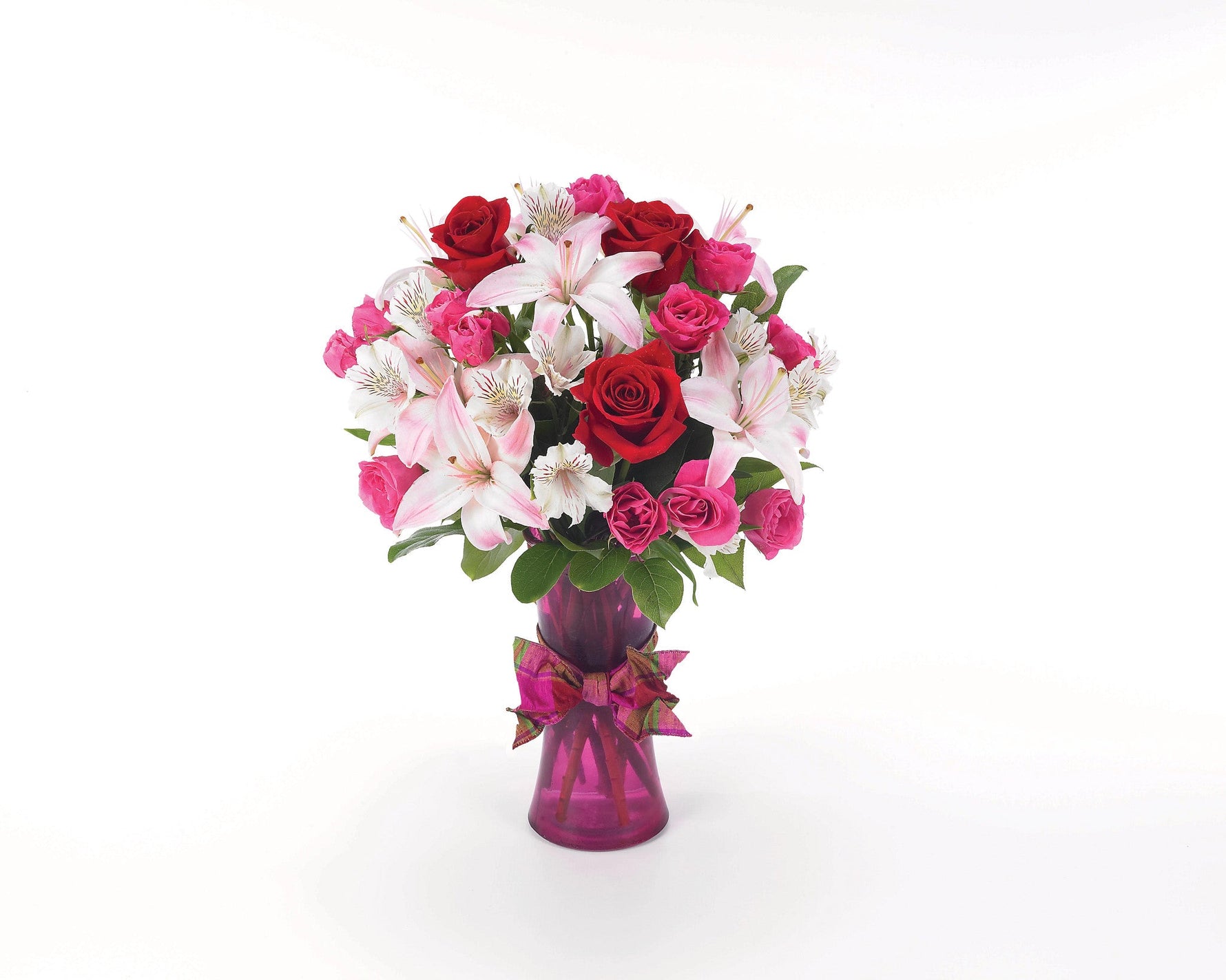 Hazle saber que siempre estará en tu corazón con este romántico arreglo de rosas, alstroemerias y lirios en un jarrón rosa acentuado con una cinta fucsia.