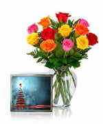 Combo de 12 rosas mixtas, jarrón y tarjeta