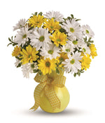 Este encantador y alegre ramo incluye 36 exuberantes margaritas blancas y amarillas y hojas frescas, ideal para cualquier ocasión. Mide aproximadamente 60 cm de alto.