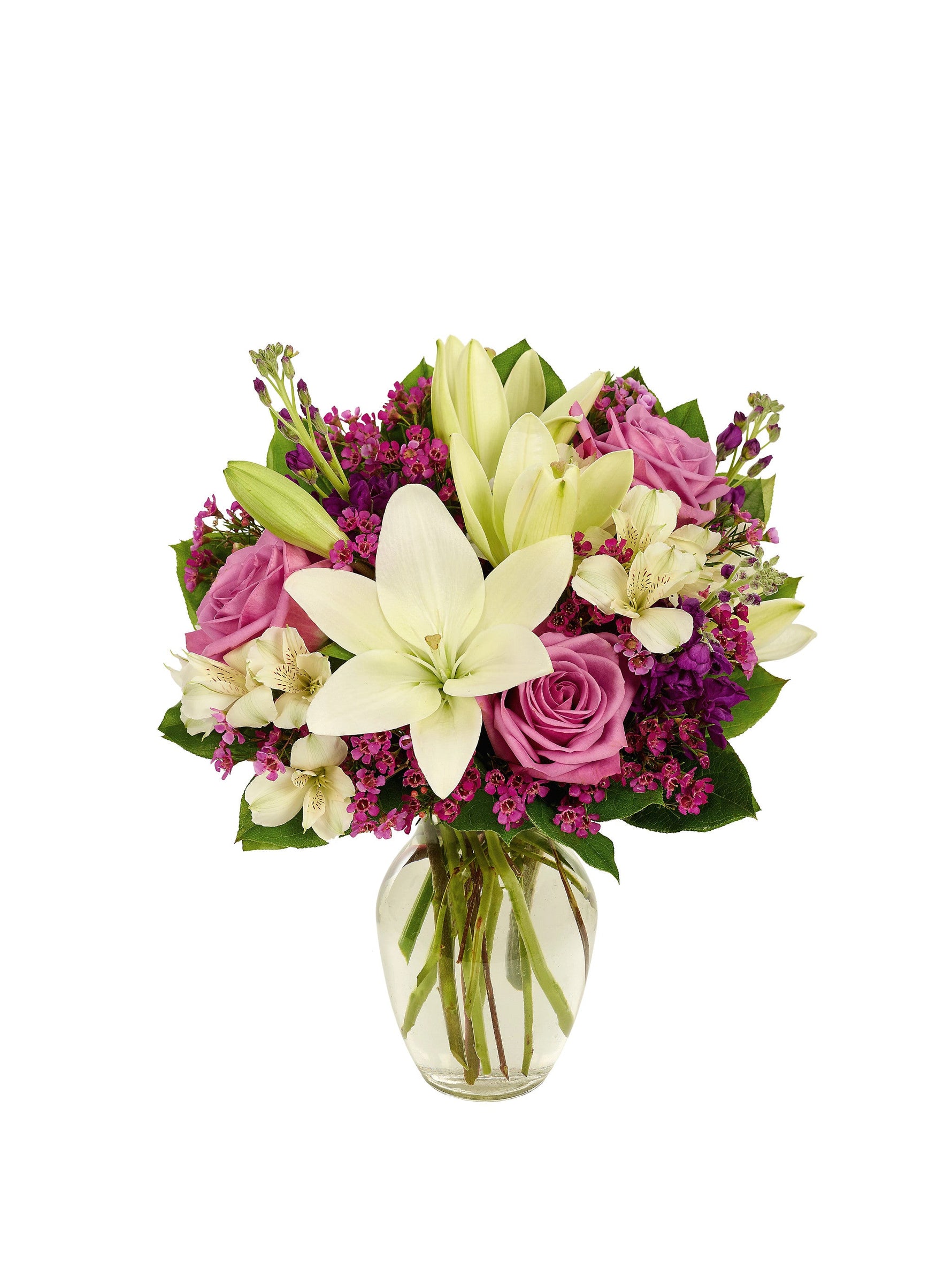 Rosas majestuosas en un elegante tono lavanda se combinan a la perfección con alstroemerias, flores de cera y lirios asiáticos para crear un ramo de singular esplendor que dice: "Gracias a ti soy quien soy hoy". Un elegante jarrón transparente lo ilustra todo. Una mezcla de flores que dice: "Jugaste un papel importante en mi vida".