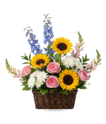 Este cautivador arreglo floral de colores brillantes le sacará una sonrisa a esa persona especial. La maravillosa combinación de elegantes flores incluye impresionantes girasoles, bocas de dragón, rosas rojas y llamativos ásteres, presentados con hojas frescas en una atractiva canasta con espuma floral especial para mantener las flores frescas durante al menos una semana.