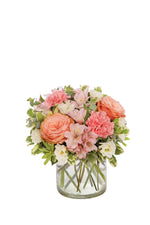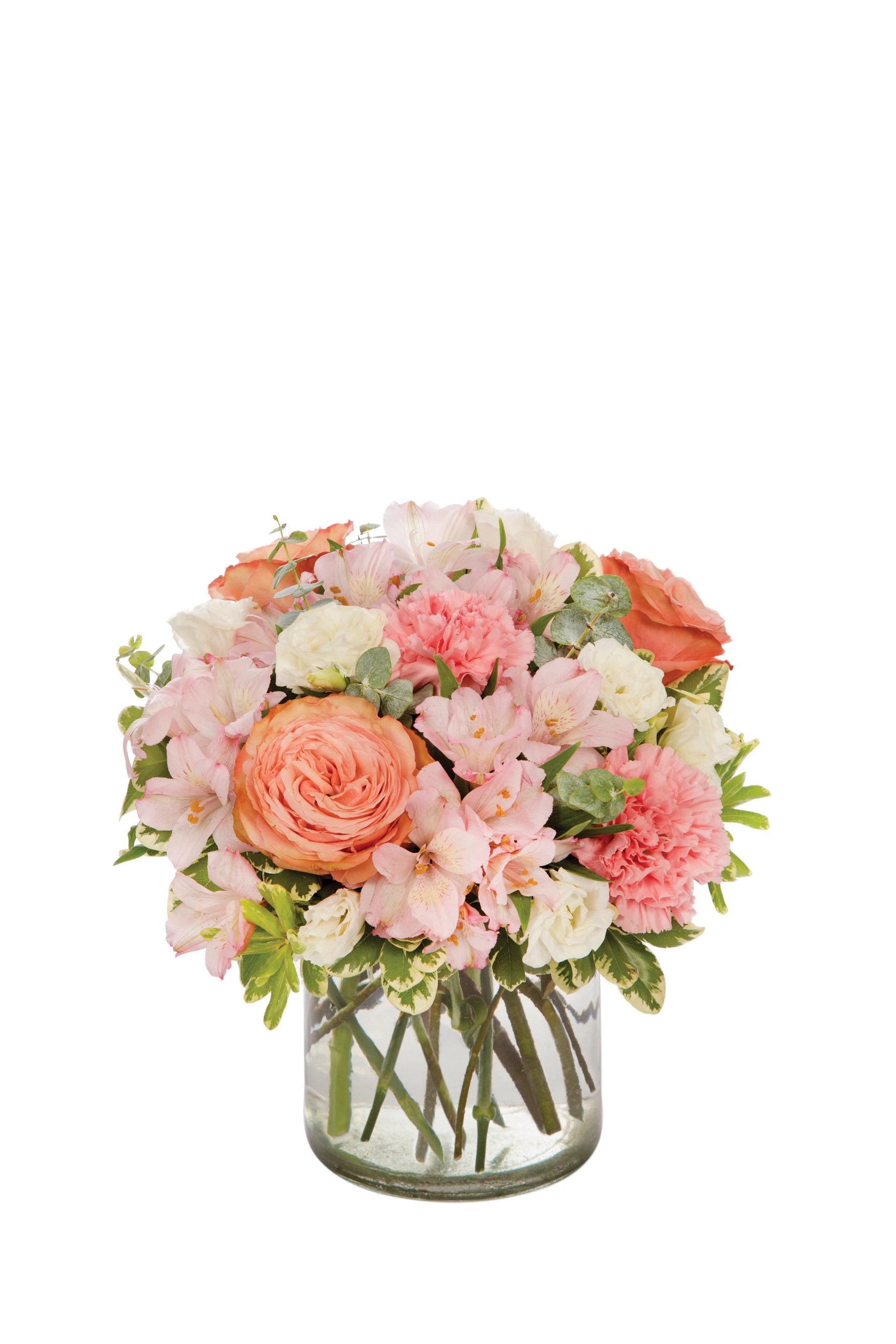 Precio unitario / porLes encantará y te agradecerán por dárselo. Encantador desde cualquier punto de vista, este ramo inspirado en el melocotón luce rosas, claveles, alstroemerias, lisantos, eucaliptos y pitósporos en un jarrón cilíndrico de vidrio transparente.