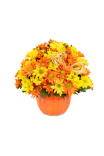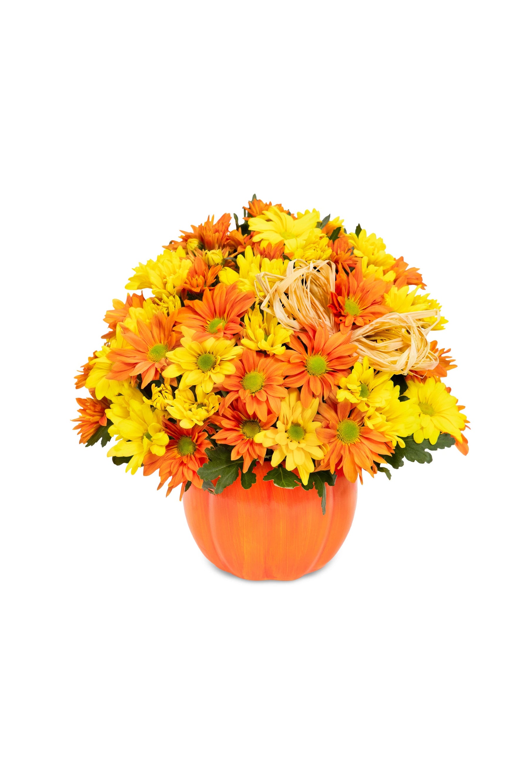 Las margaritas naranjas se combinan con margaritas amarillas para crear un precioso ramo otoñal. El Daisy Pumpkin Patch está elaborado a mano en un recipiente de cerámica con forma de calabaza y rematado con un lazo de rafia. Este arreglo otoñal con diseño de margaritas es un regalo otoñal maravilloso.