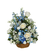 Tranquilidad es la palabra que viene inmediatamente a la cabeza para describir esta serena pero excepcional creación floral de delphinium azul, rosas blancas, mini claveles blancos y alstroemerias blancas en una canasta de sauce.