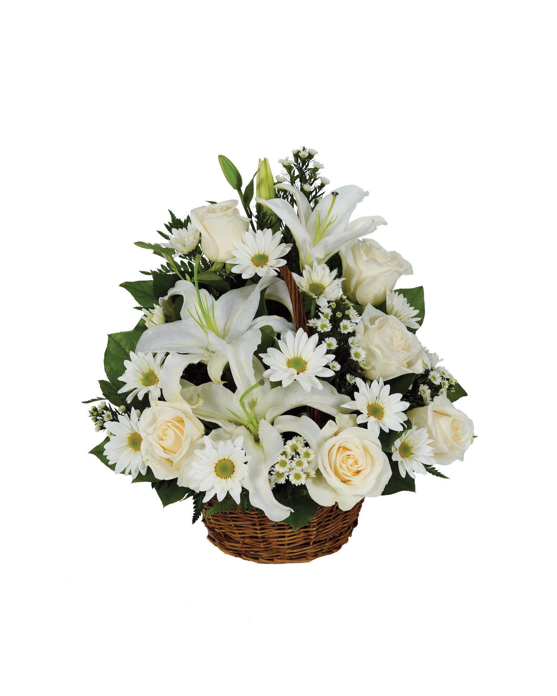 ¿Piensas en alguien especial? Hazle saber que lo tienes presente con esta encantadora combinación de rosas, lirios, gerberas y margaritas... todo en blanco, en una encantadora canasta de mimbre.