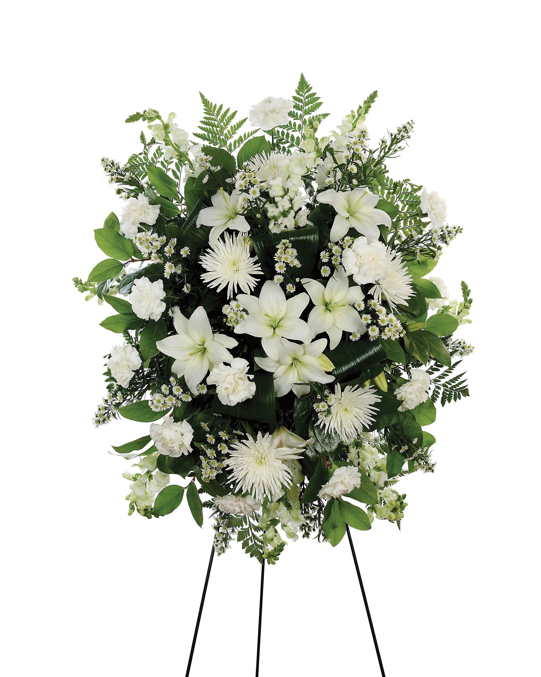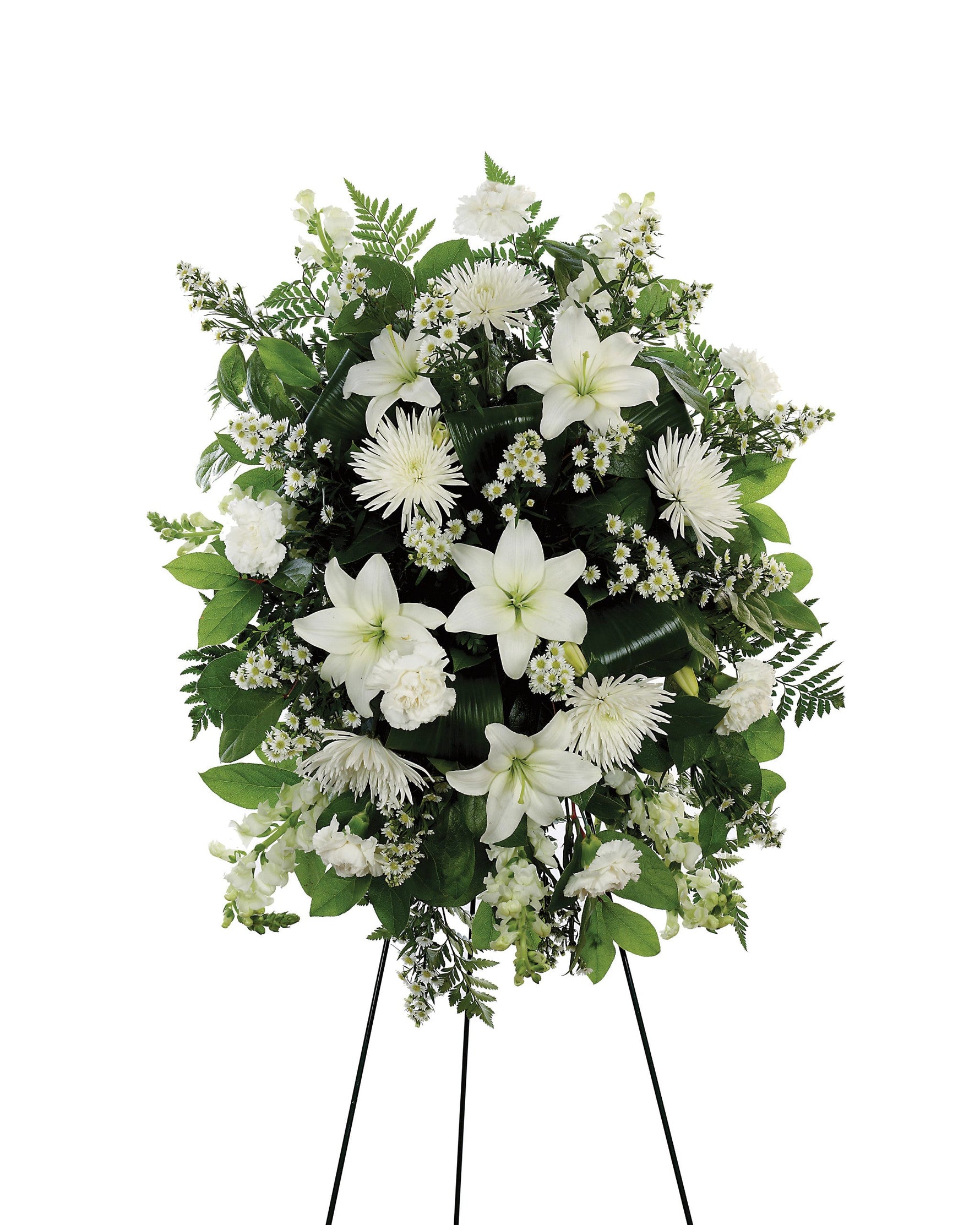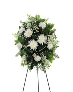 Precio unitario / porCrisantemos blancos, claveles, flores de Monte Casino y boca de dragón sobre un caballete independiente transmiten simpatía y recuerdo de una manera elegante.