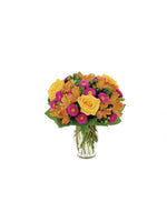 Piensa en alguien que realmente te importa, alguien a quien quieres hacer sonreír con alegría. Esa es la persona que merece este encantador arreglo con áster Matsumoto rosa intenso, rosas amarillas, hipérico verde, alstroemerias naranjas y trachelium verde en un jarrón acanalado.
