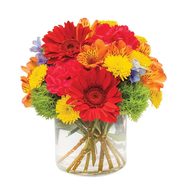 Además de su evidente belleza, esta brillante creación botánica despliega un vívido brillo de creatividad propio. Gerberas, pompones, claveles, delphinium, garrapatas verdes y alstroemerias se combinan a la perfección en un vibrante recipiente cilíndrico adornado con coloridas flores.