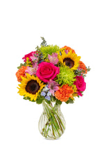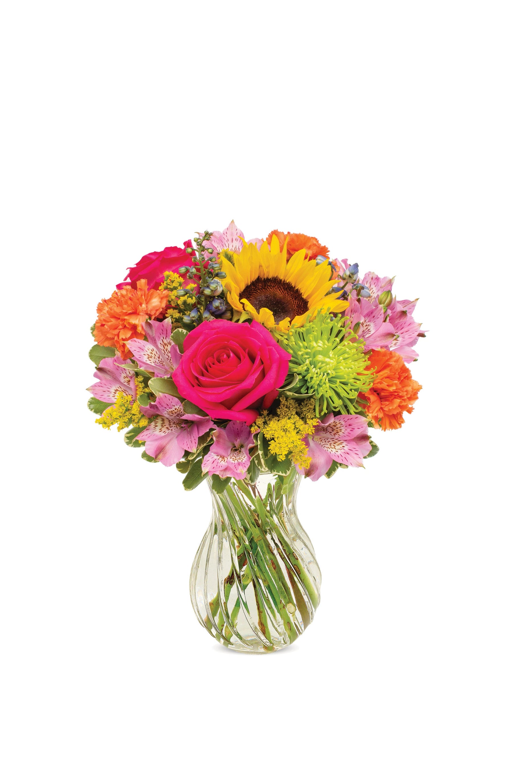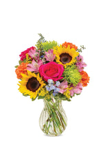 Transpórtate a una mañana tranquila mientras el sol ilumina un prado apacible. Esa es la sensación que crea este ramo, con girasoles, rosas, alstroemerias, claveles, fuji, delphinium y solidago dispuestos en un jarrón transparente con espirales.
