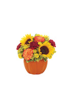 Precio unitario / porRecibirá muchas gracias cuando su destinatario vea esta magnífica colección de girasoles, rosas, pompones, claveles y solidago en una maceta de calabaza con un brillante esmalte. Un maravilloso complemento decorativo para cualquier mesa o estante durante el otoño y la temporada de Acción de Gracias.