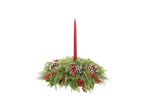 Un paraíso navideño, completo con todos los adornos, cobra vida en este centro de mesa muy especial, complementado perfectamente con bayas brillantes, verduras navideñas, piñas y una vela en un recipiente de diseño.