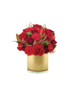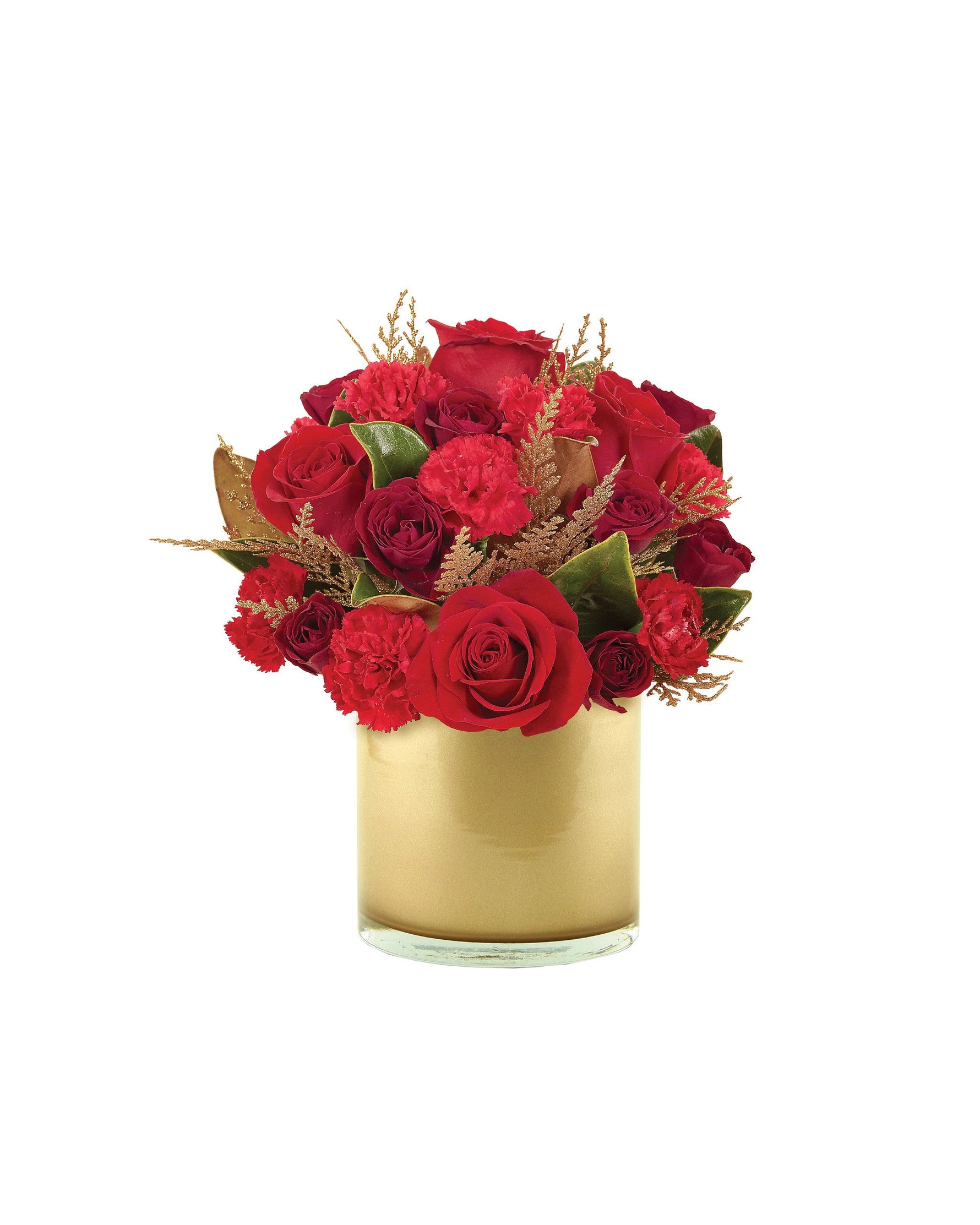 ¡Todo lo que brilla es oro en este sensacional ramo navideño! Un cilindro de cristal dorado sirve de base para un imaginativo arreglo de rosas, rosas en spray y miniclaveles, complementado con una punta de magnolia y una rama dorada con purpurina.