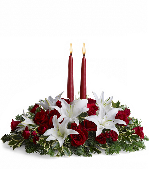 Este luminoso centro de mesa es una forma brillante de difundir la alegría navideña. Ya sea en la mesa del comedor o en cualquier otro lugar, iluminará cualquier habitación con alegría navideña. Este tradicional centro de mesa navideño incluye rosas rojas, lirios asiáticos blancos, hojas de invierno y dos velas.