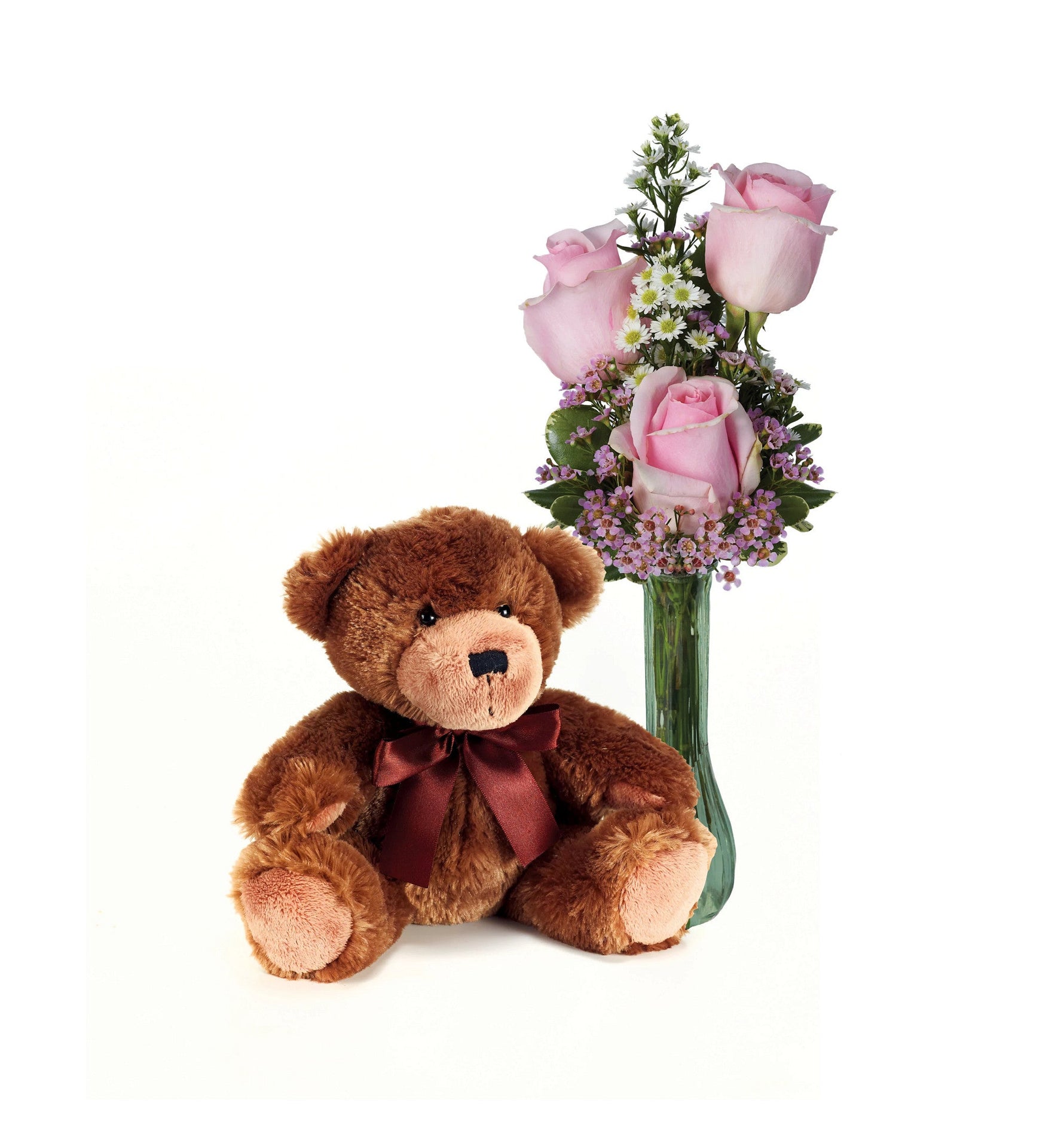 Prix unitaire / parIrrésistible à tous points de vue, cette composition florale, agrémentée d'un adorable ourson portant un nœud en satin rose, ne manquera pas de faire sourire. Un petit vase transparent accueille des roses rose pâle, des fleurs de cire roses et des fleurs blanches de Monte Casino.