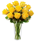 Comprend une douzaine de roses jaunes fraîches, coupées, à longues tiges, d'une beauté et d'une vivacité exceptionnelles, agrémentées de verdure fraîche.