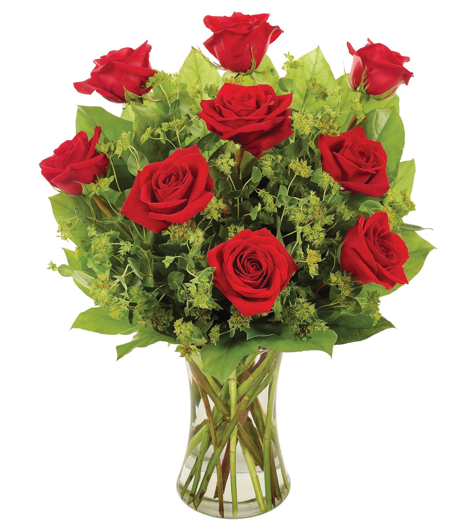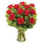 Absolument irrésistible, ce bouquet incarne l'élégance à tous les égards. De superbes roses, sublimées par un buplèvre resplendissant, forment le point central de cette magnifique composition, présentée dans un vase transparent.