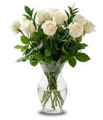 Comprend une douzaine de roses blanches fraîches, coupées, à longues tiges, d'une beauté et d'une vivacité exceptionnelles, agrémentées de verdure fraîche.